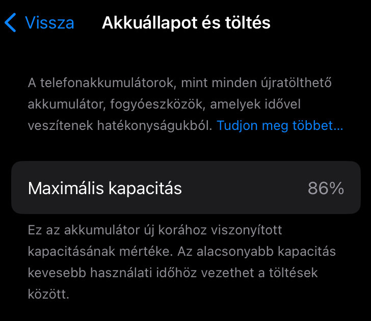 Maximális akkumlátor kapacitás: 86%