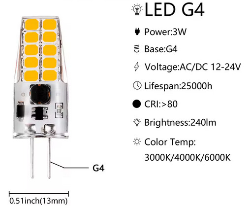 2 db G4 LED (lásd 3. kép), meleg fehér, dimmelhető 3W - 500 Ft/db