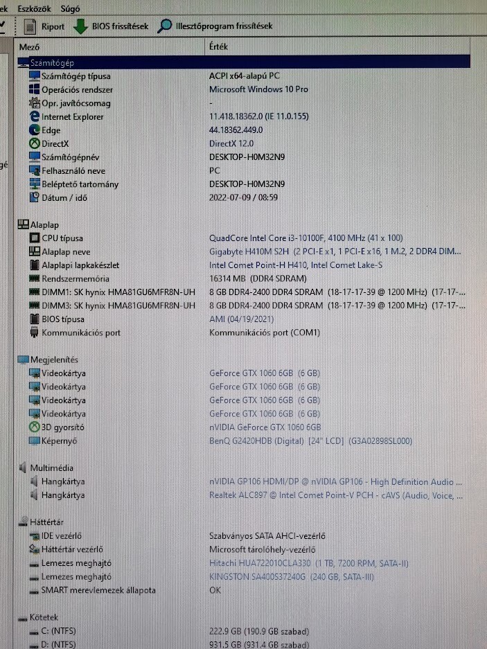 Játszós PC i3 10100F 16GB DDR4 GTX 1060 6GB 240GB SSD + 500GB HDD