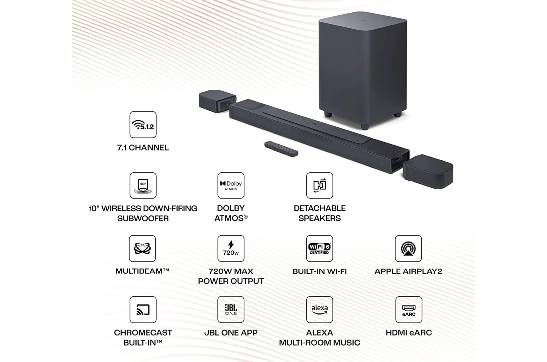 Összesen 720 W kimeneti teljesítménnyel és egy 10 hüvelykes vezeték nélküli mélysugárzóval rendelkezik.