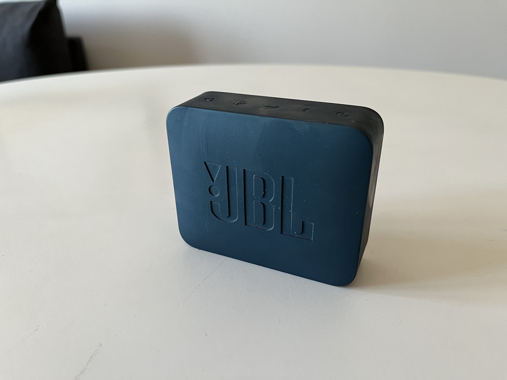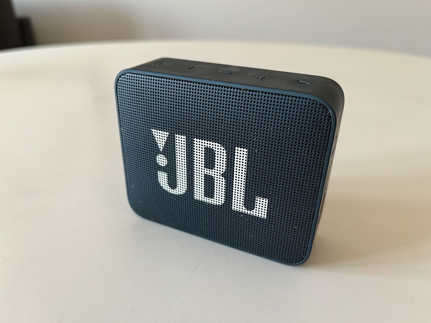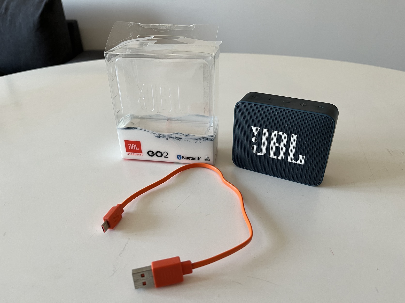 Eladó a képeken látható JBL Go 2 hordozható Bluetooth hangszóró. Sötétkék színű, megkímélt, szép állapotban van, ahogy a fotókon is látszik.