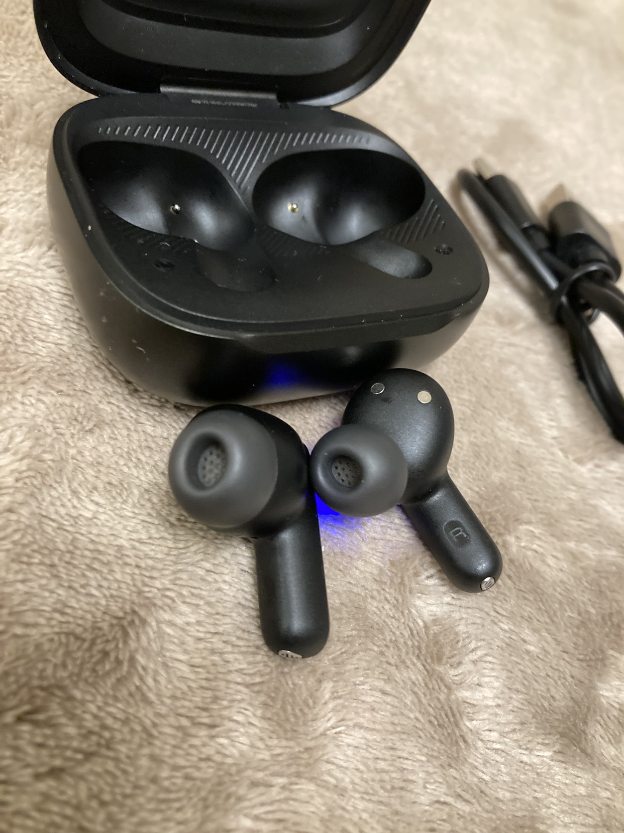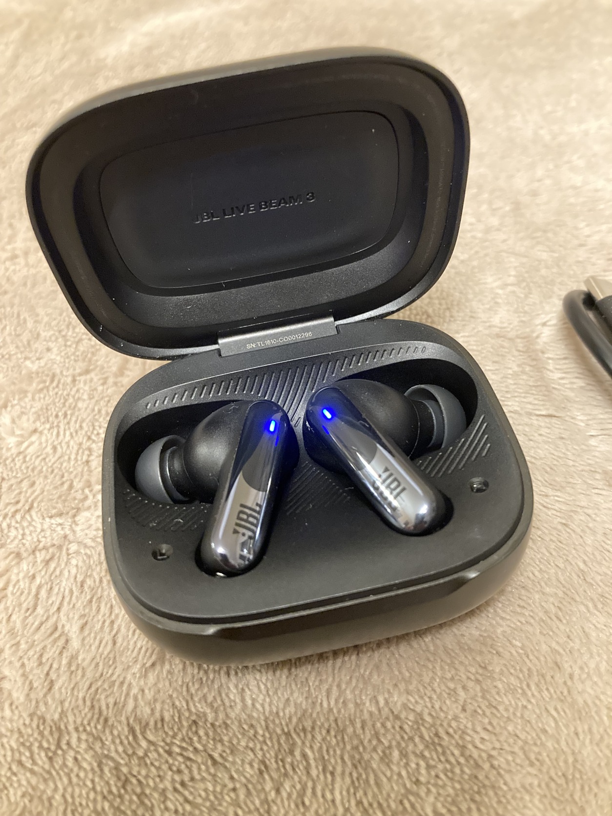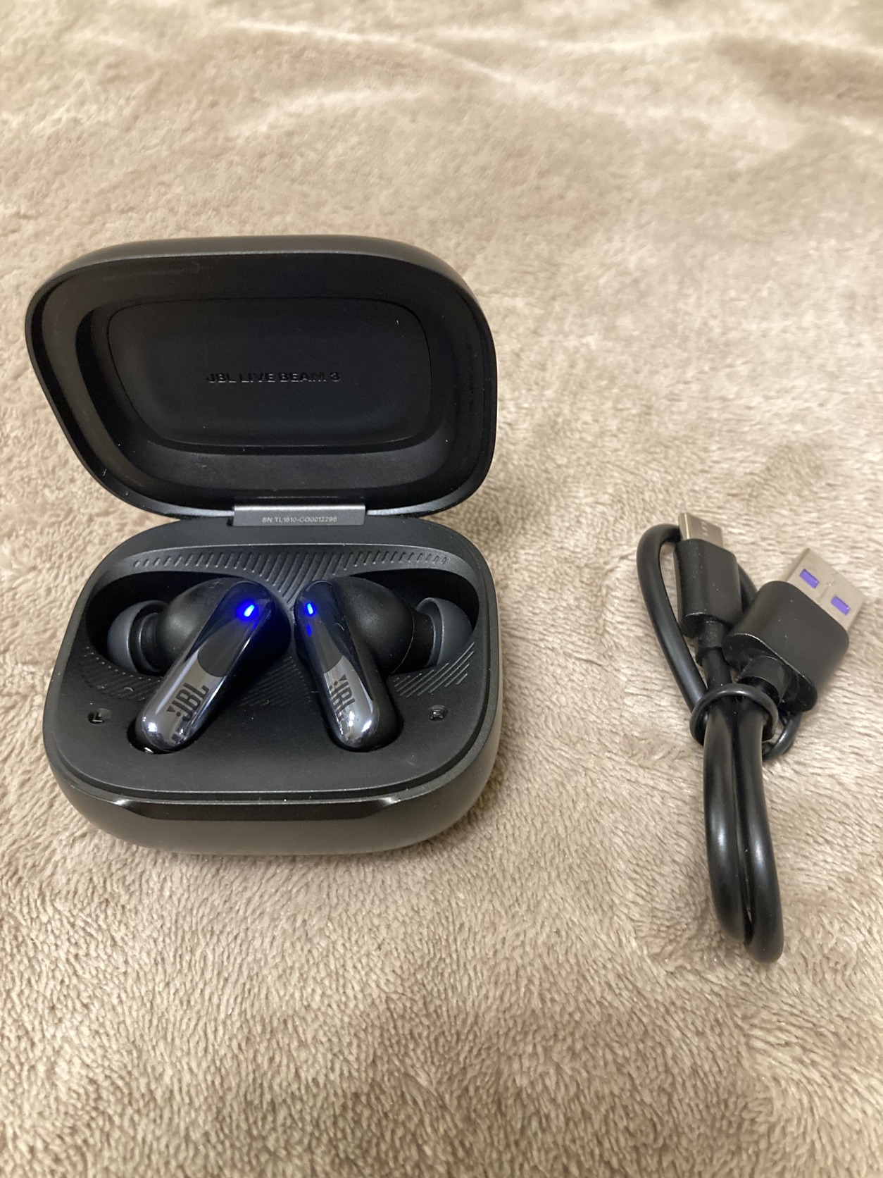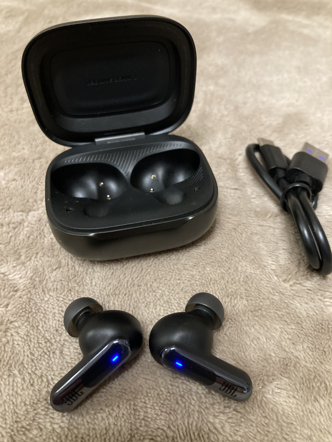 JBL Live Beam 3 bluetooth fülhallgató gyári M méretű gumival, tartalék JBL Live Pro2 SML gumiszettel (amivel tökéletesen szól sőt több a basszus) , töltőkábellel, cipzáras hordtáskával, újszerű állapotban, 99% os akkuval. KB 10 percet ment.