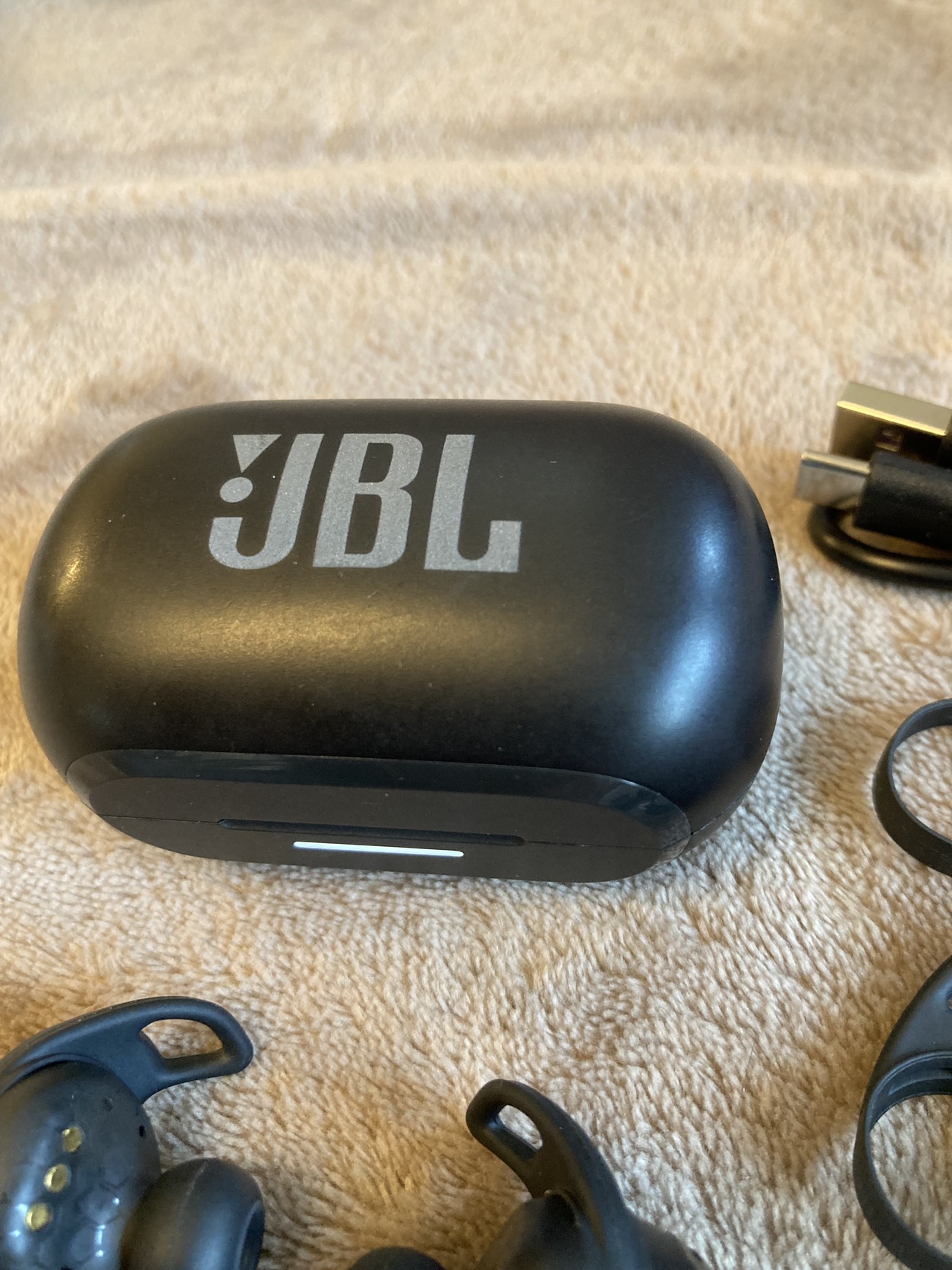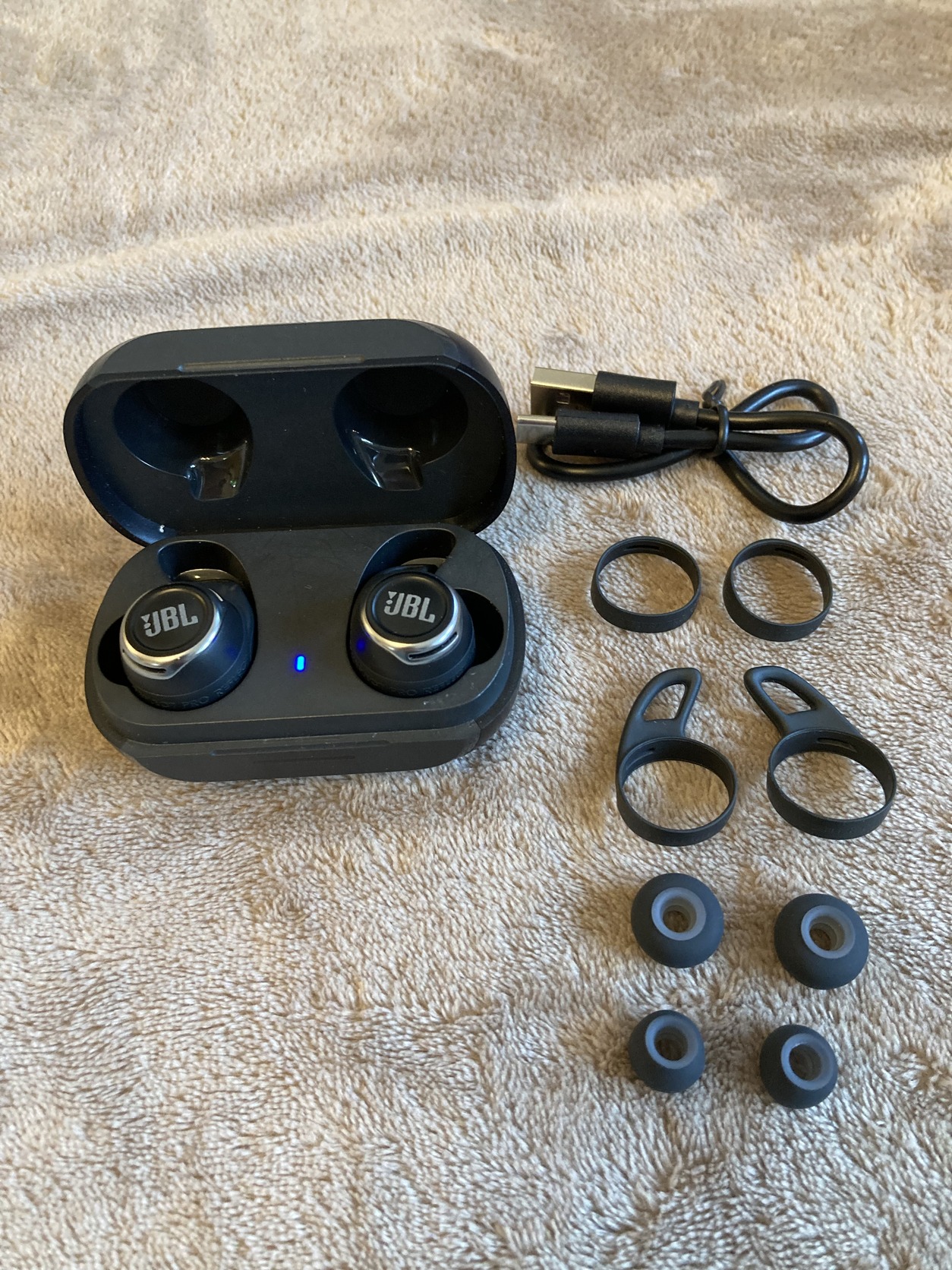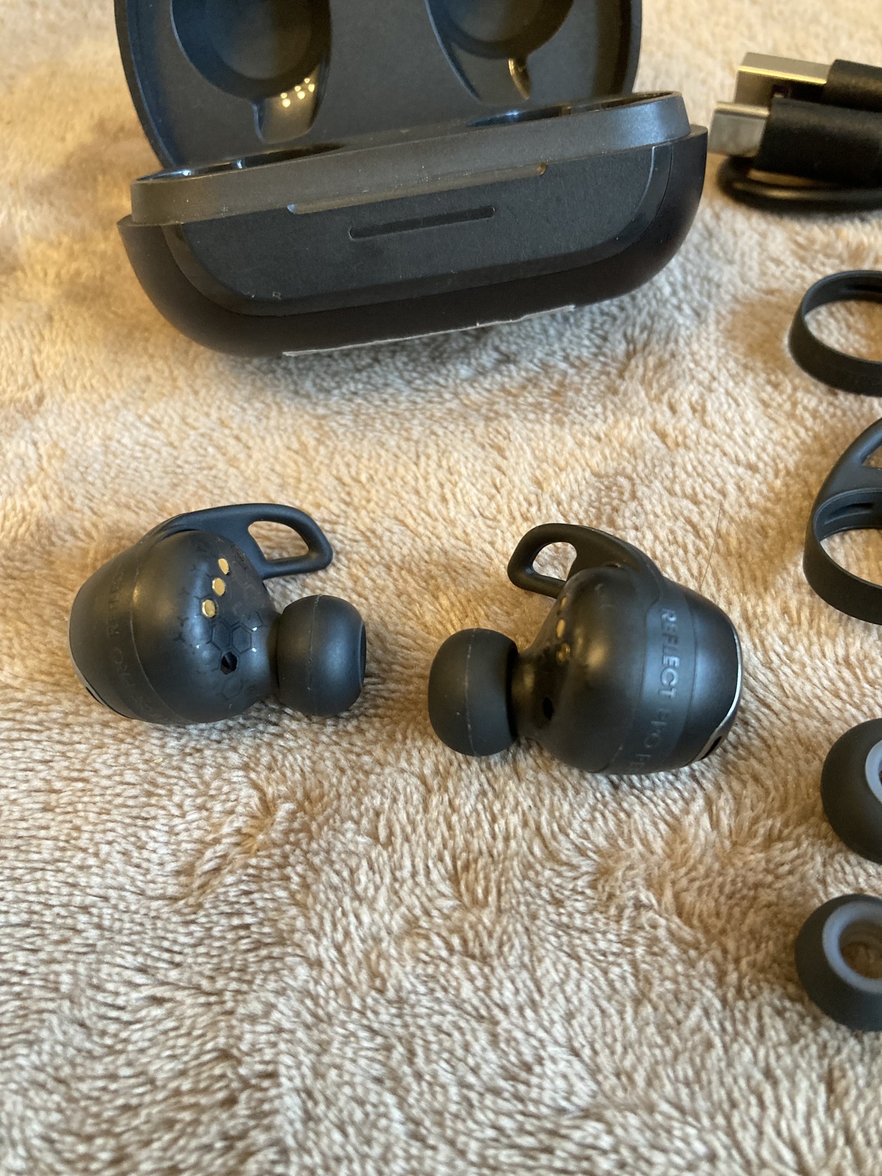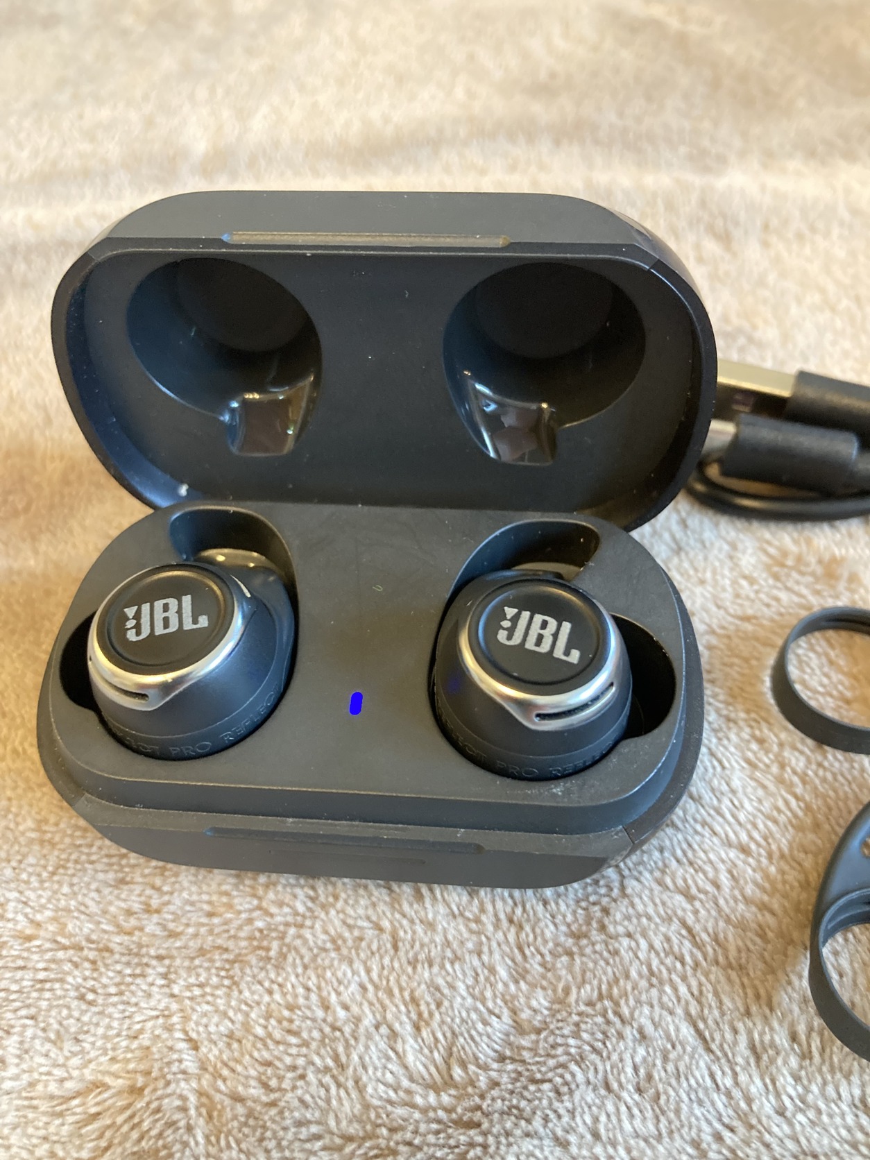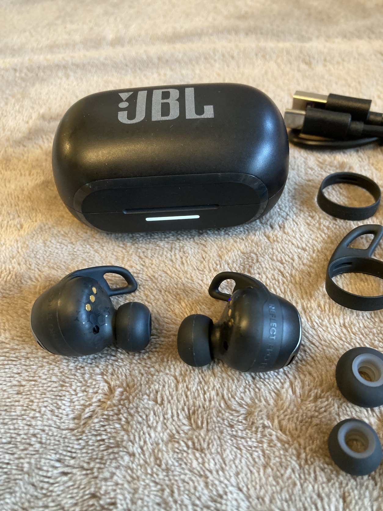 Eredeti JBL Reflect Flow Pro zajszűrős bluetooth fülhallgató töltőkábellel, gyári XS M és L támasztékokkal, S M L fülgumikkal. Akkuja kíváló, 8-9 óra körül megy.