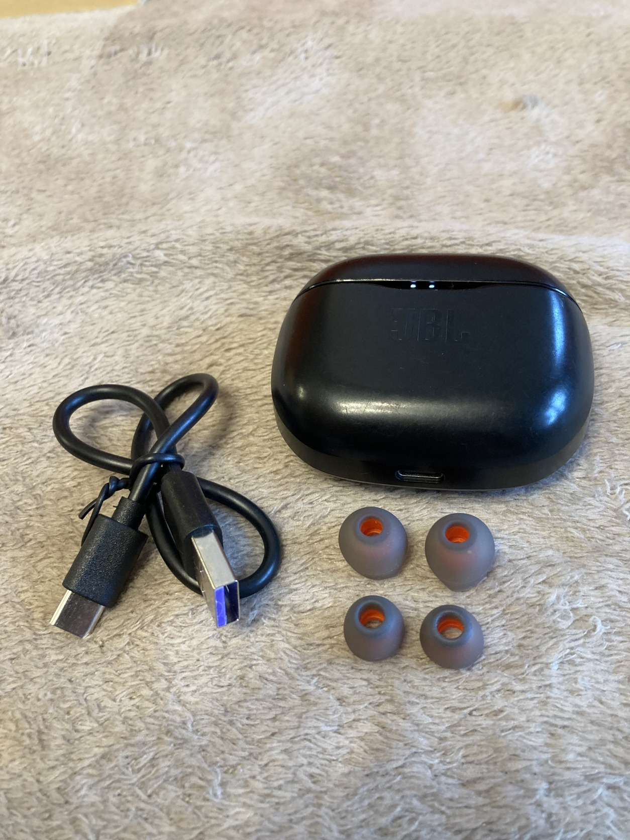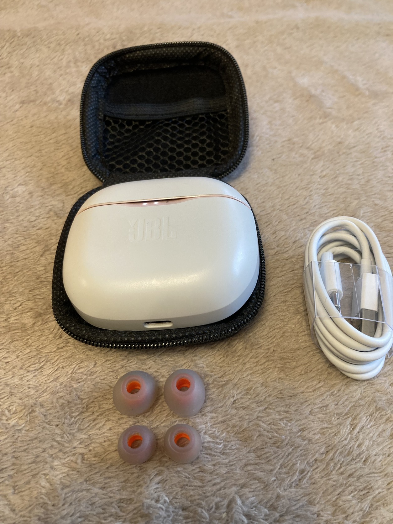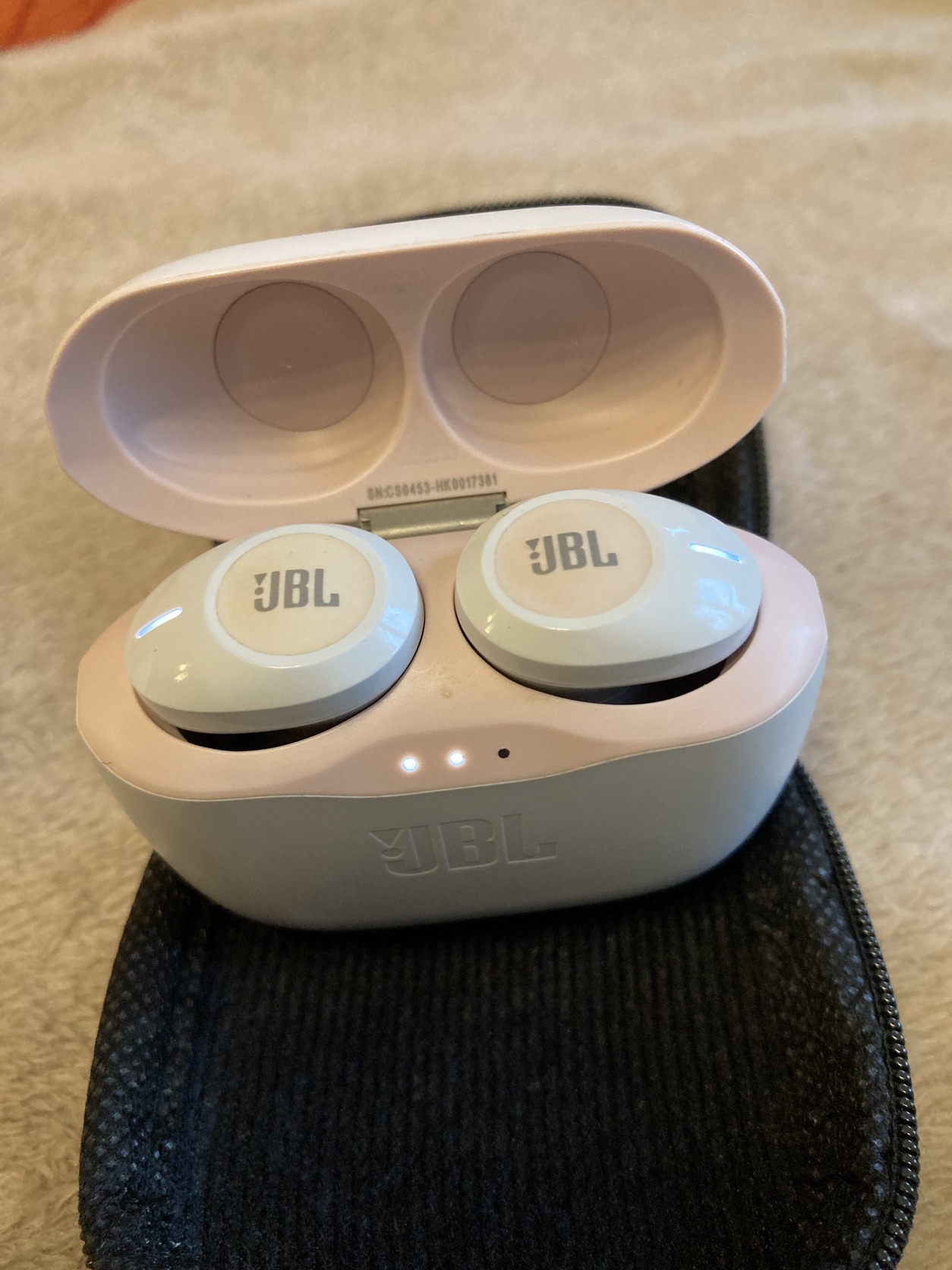 Eredeti JBL Tune 125 TWS bluetooth fülhallgató töltőkábellel, SML méretű gumikkal, cipzáras hordtáskában, erős akkuval.