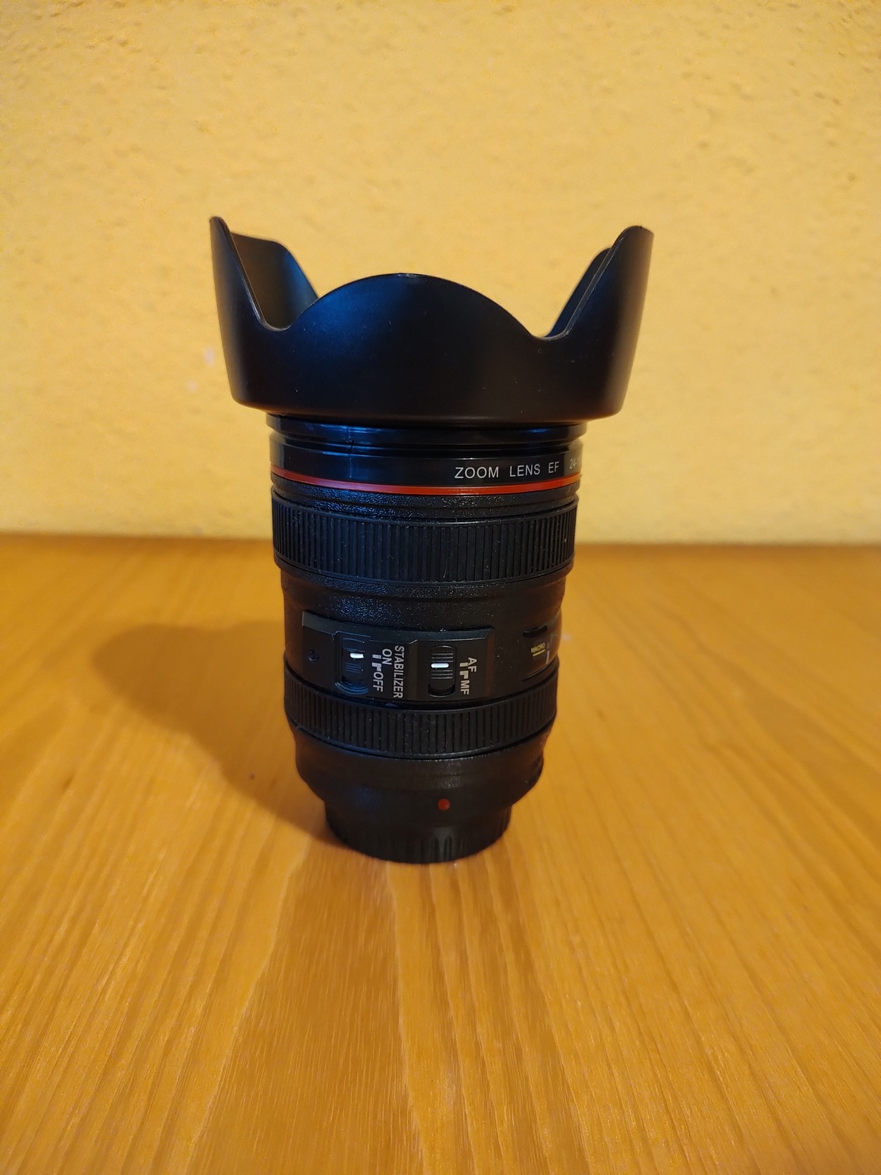 Eladó egy csak dekorációnak használt objektív kinézetű (Canon EF 24-105 L) műanyag bögre. Fotósoknak hangulatos ajándék lehet.