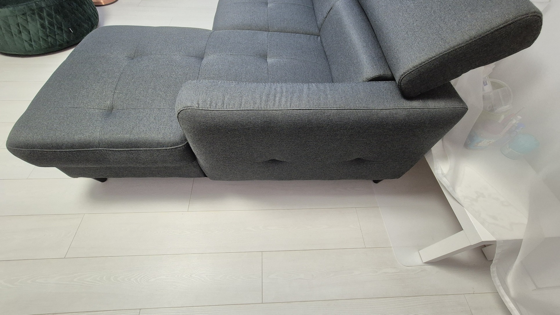 Eladó a képeken látható sötétszürke/szürkészöld szövetű, térbe helyezhető, L-alakú kanapé.