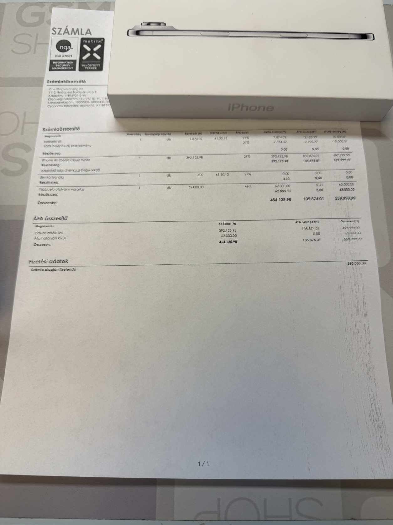 One vásárlás egy összegben fizetve lista áron! (számla!)