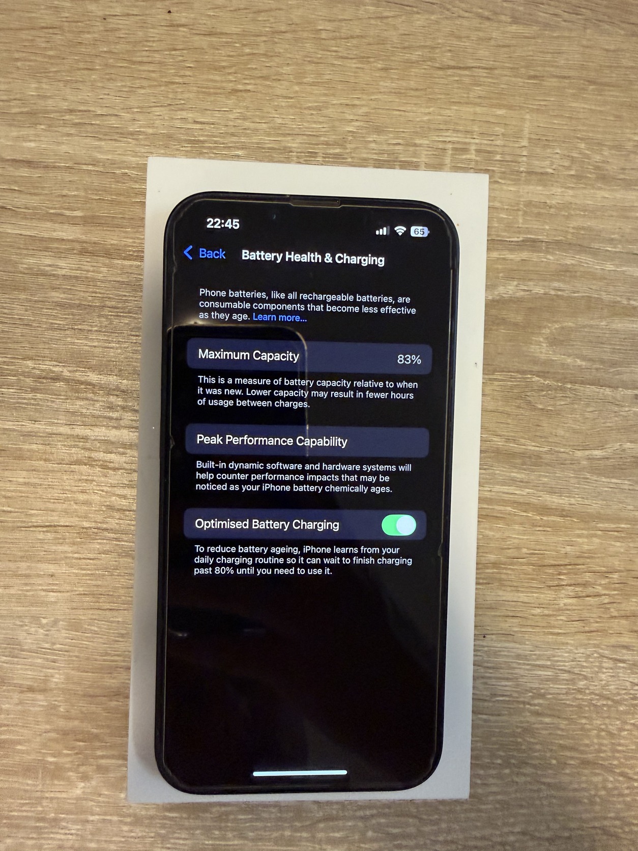 Akkumulátora 83%-os, ami még mindig nagyon jól tartja magát, nem csökkent az üzemidő a gyári állapothoz képest.
