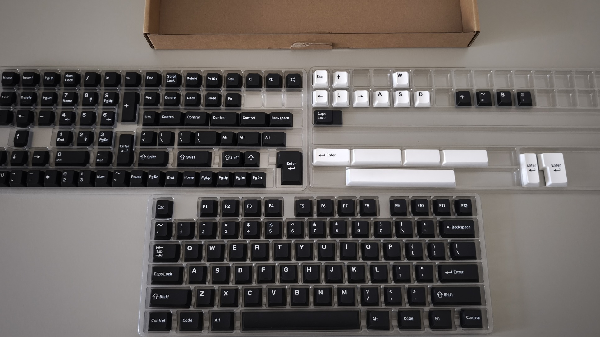 Rengeteg keycap (175 db összesen), GMK Clone, Cherry Profile, tartalmaz minden szükséges billentyűt bármilyen méretű ANSI / ISO billentyűzethez (nagy enter, hosszú shift, "osztott" bal shift, osztott space stb., amit szeretnél). Fekete alapon fehér betű + néhány inverz extra, ha esetleg fel szeretnéd kicsit dobni a kinézetet.