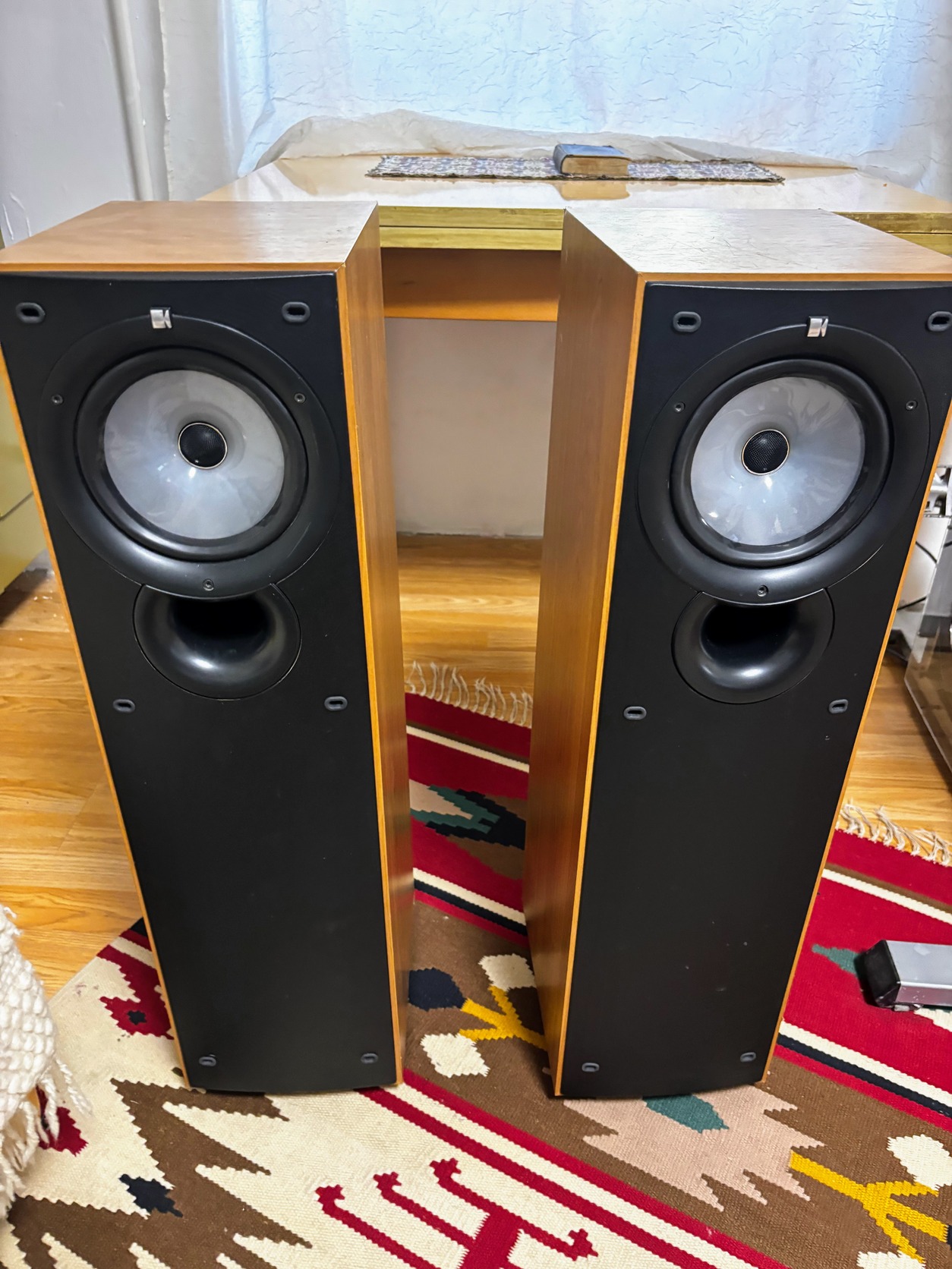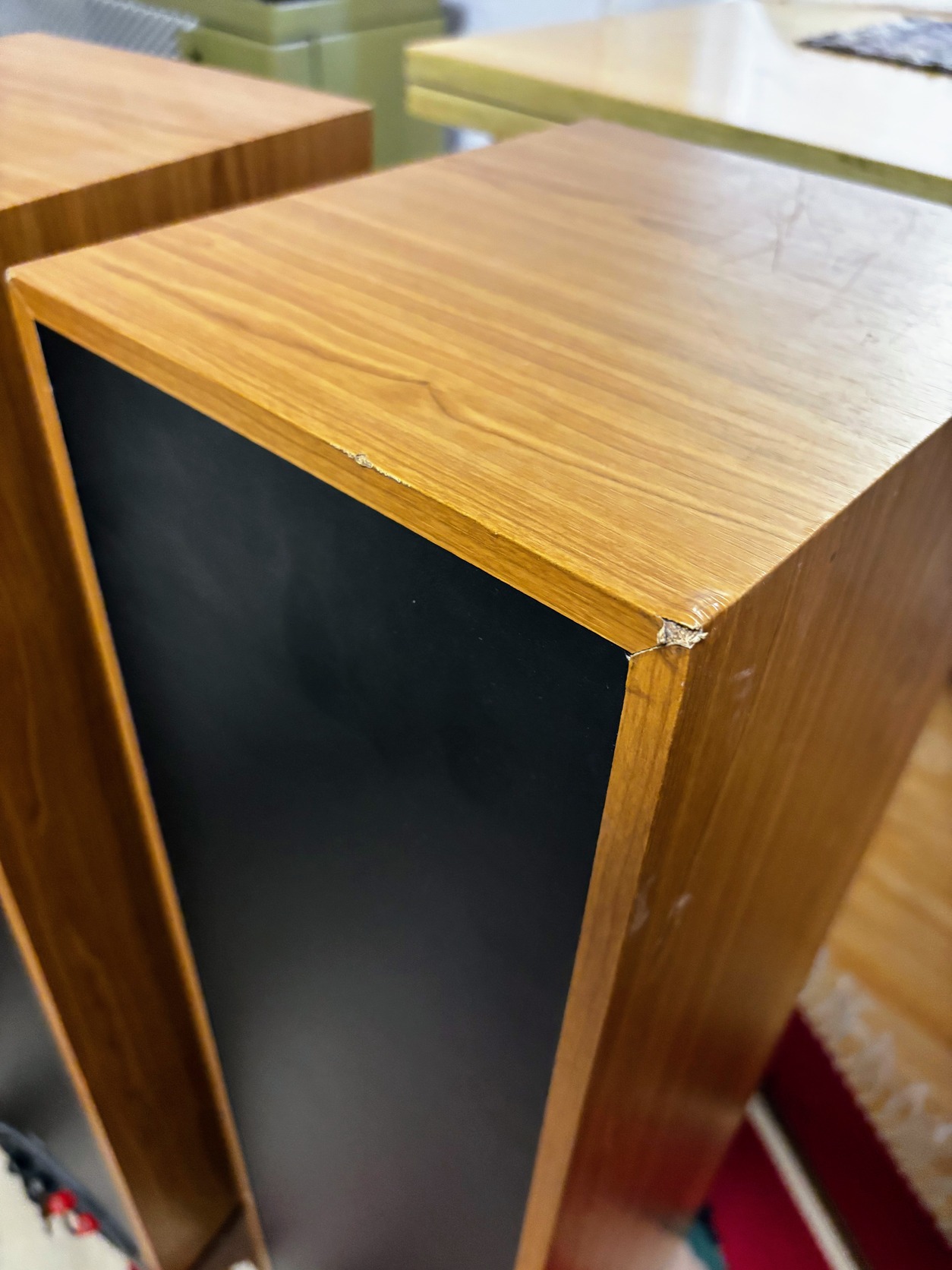 A hangfalak gyárilag fóliázottak, ezeken apró karc előfordul, és az egyik hátsó sarkon van kisebb sérülés, ezt fotóztam.