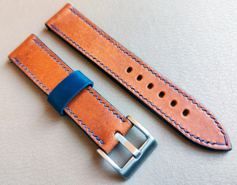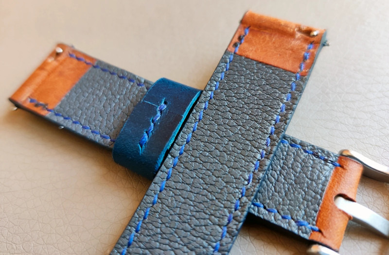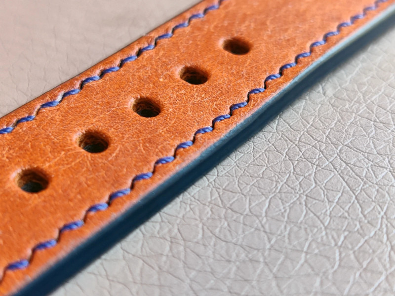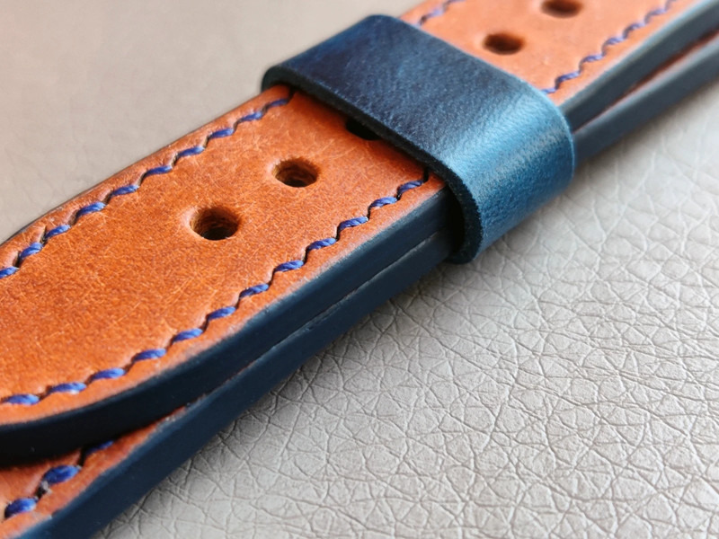 Teljes mértékben kézzel készült bőr óraszíj. Eredeti narancsos/barnás olasz Pueblo bőr felső és puha szürke színű kecskebőr alsó résszel. Sötétkék öltésekkel és sötétkék szélfestéssel.