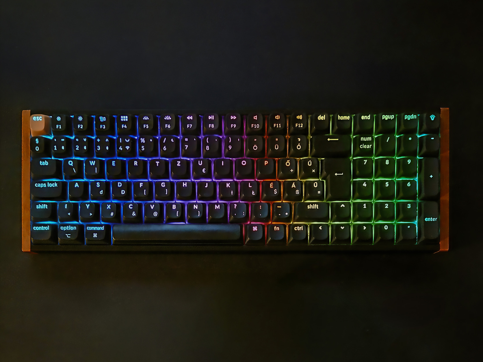 Magyar kiosztású, vezeték nélküli (2 vezeték nélküli és vezetékes módot is támogató) mechanikus billentyűzet, Gateron double-rail magnetic nebula kapcsolókkal. 1kg fölött van a súlya, fém kerettel, fa berakással a széleken.