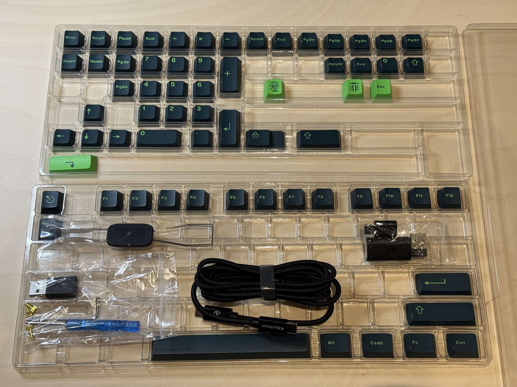 - Ink Green PBT Double Shot Cherry profilú billentyűsapkákkal (aliexpressről van, szintén jó minőségű), adom a teljes szettet
