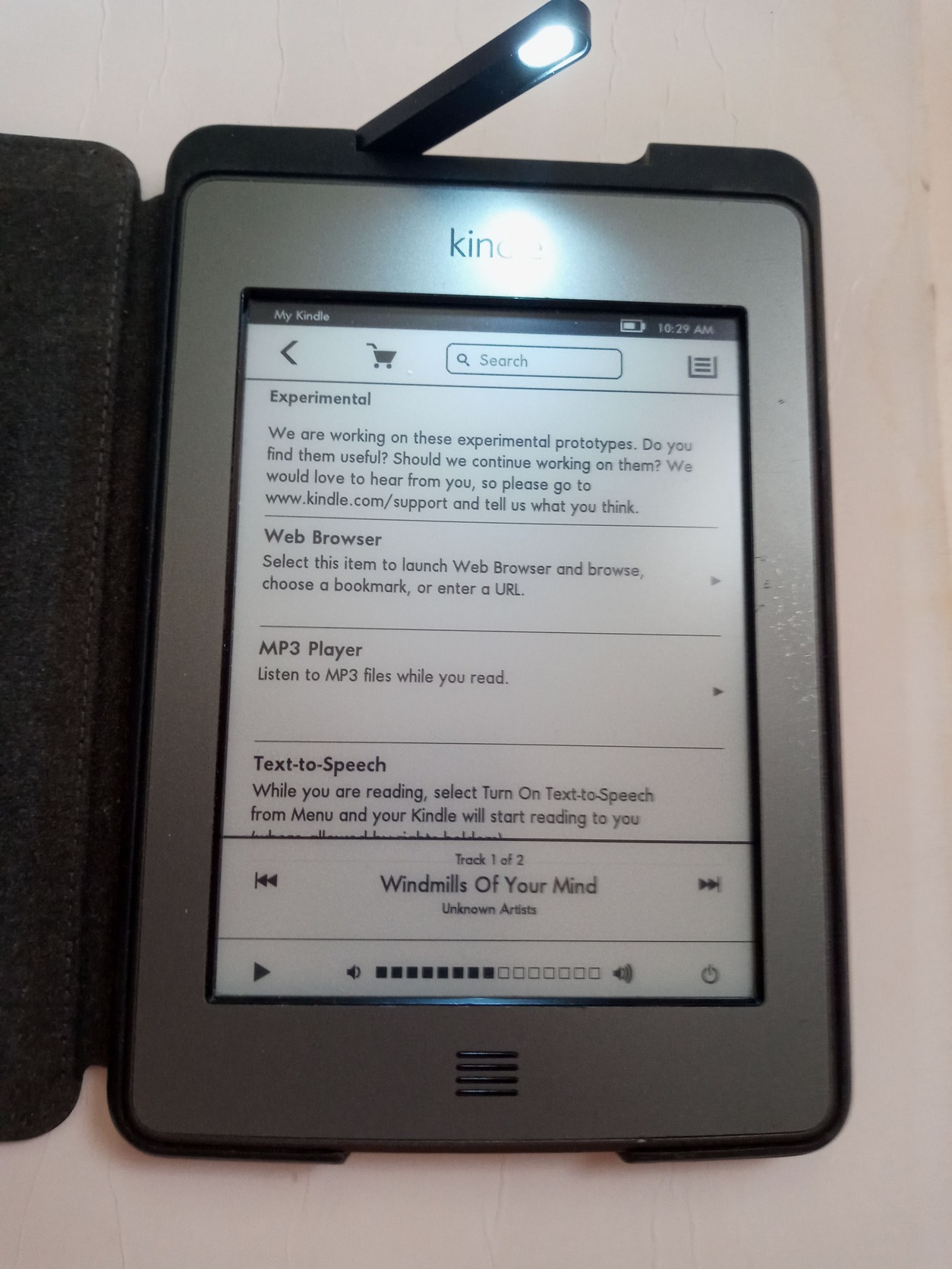 Egyedi Kindle típus, ritkán látható képességekkel: hangszórók, mp3 zenejátszás (olvasás közben), fejhallgató jack, DRM-free audiobook player, jó hangú angol TTS képernyői szöveg olvasás, dedikált Power-off gomb
