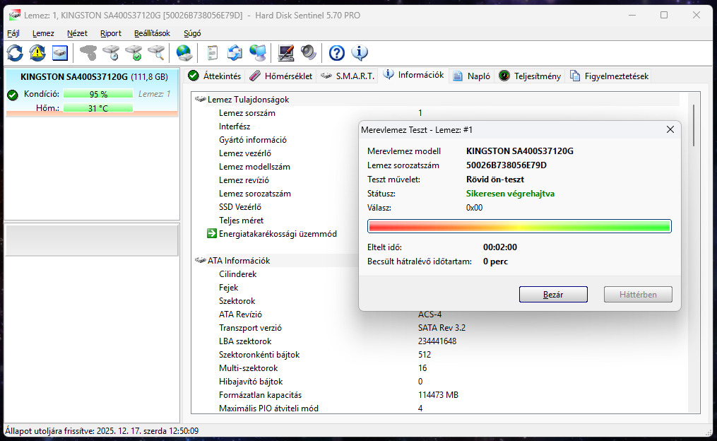 A képen látható tesztelt, hibátlan 2,5"-os Kingston A400 típusú 120GB méretű SSD eladó.