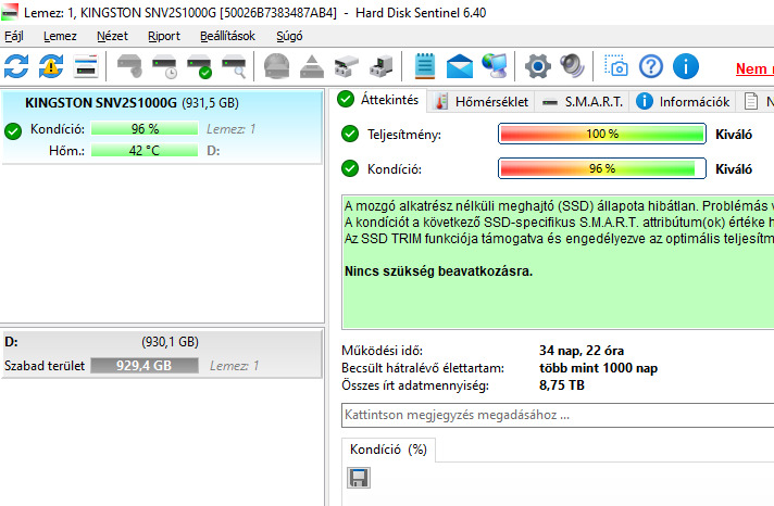 Összes írt adat (TBW): Mindössze 8,75 TB, ami a gyári élettartamhoz képest elenyésző.
