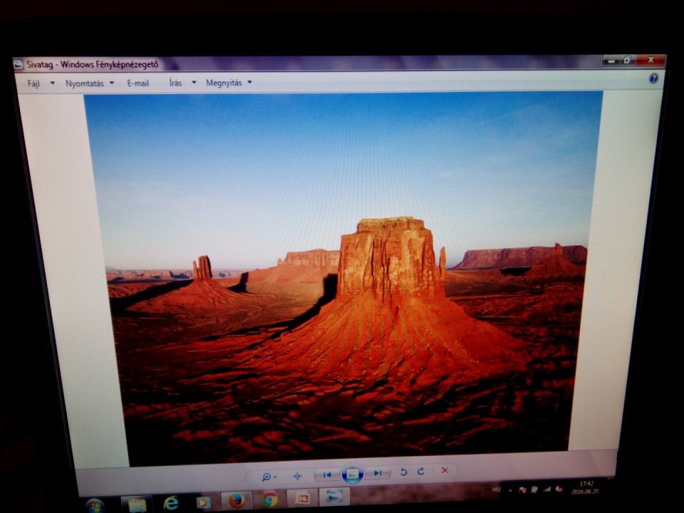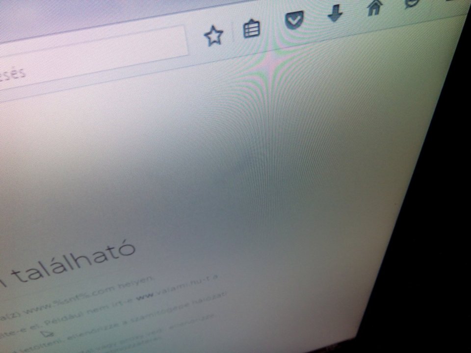 A képernyőn van egy apró nyomódás, mely miatt egy halvány folt látszik fehér háttérbél felülről nézve. Próbáltam fotózni, elég nehéz volt, mivel nem igazán észrevehető. Színes háttérnél egyáltalán nem látható.