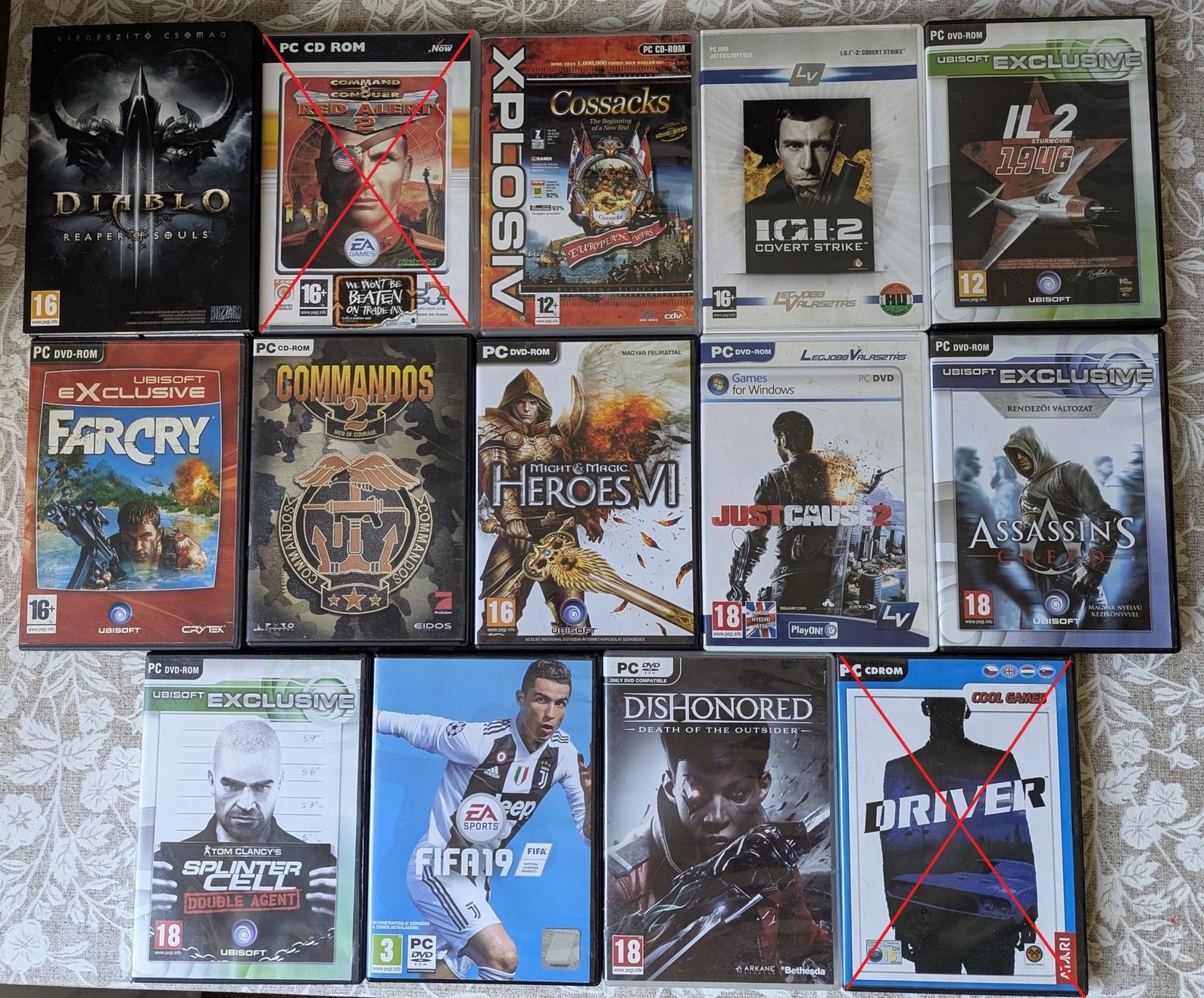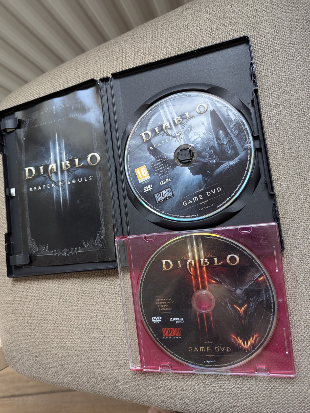 - Diablo3 (csak lemez, kód nélkül) + Reaper Of Souls kiegészítő (eredeti tokban, füzettel, telepítő kód, melynek működéséről nincs infóm, de bizonyára aktivált)