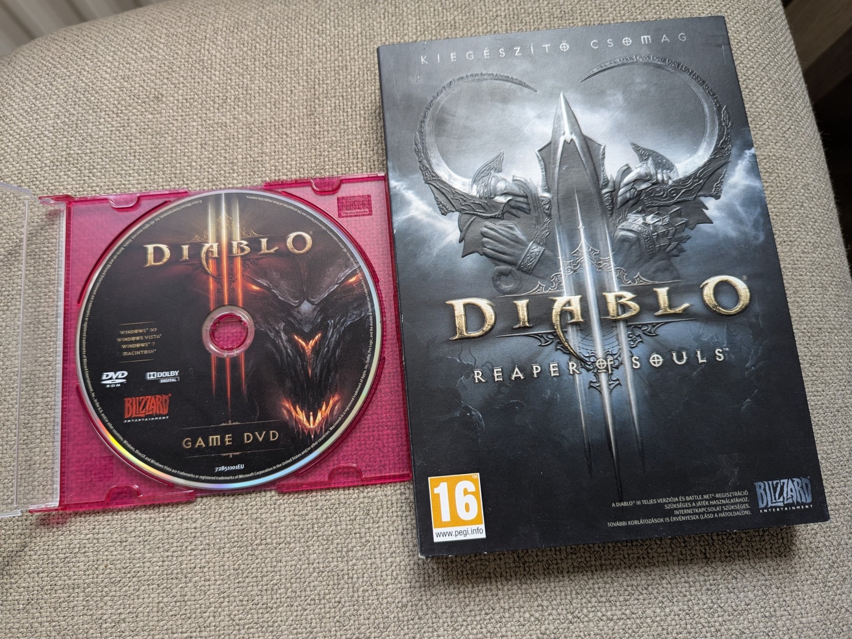 - Diablo3 (csak lemez, kód nélkül) + Reaper Of Souls kiegészítő (eredeti tokban, füzettel, telepítő kód, melynek működéséről nincs infóm, de bizonyára aktivált)