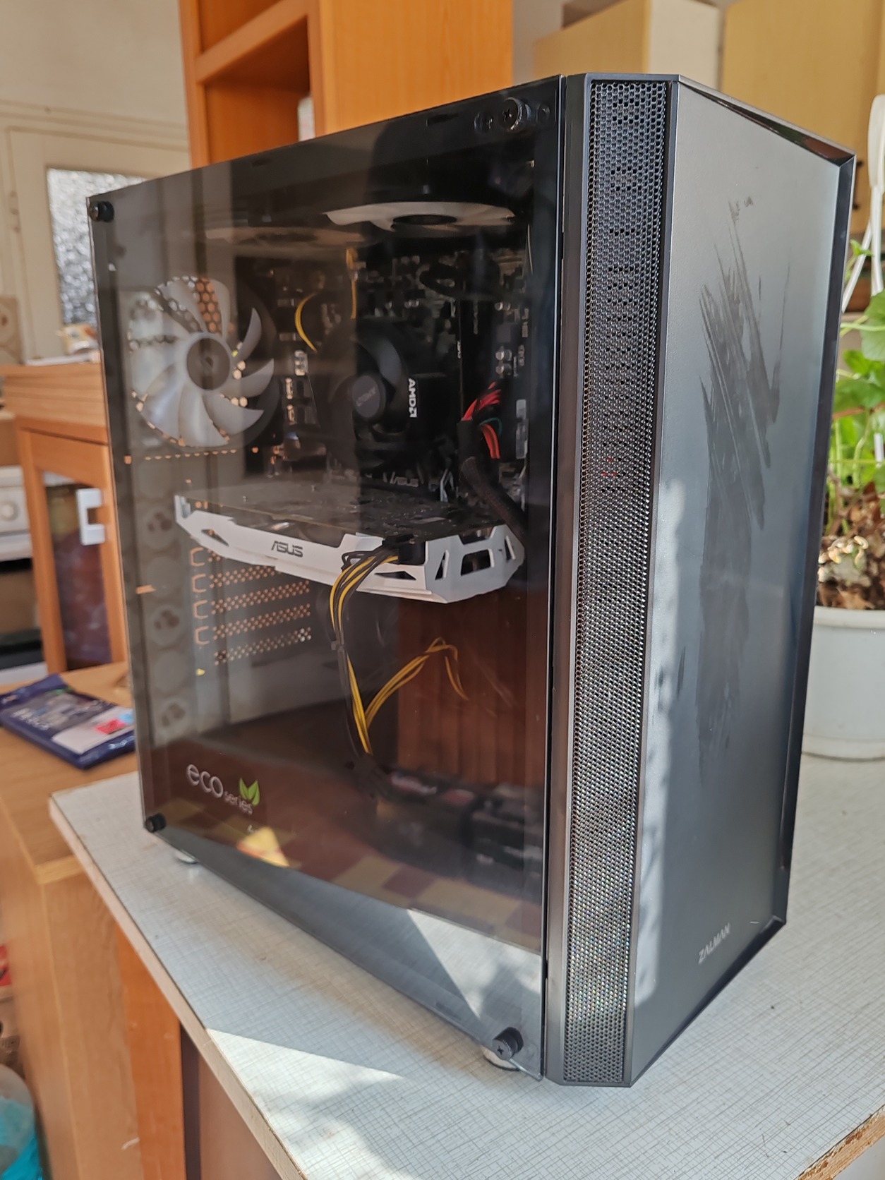 HÁZ: Zalman de a pontos típusát már nem tudom nincs meg a doboza, 3 aktív ledes ventilátorral rendelkezik illetve üveg oldalfalal.