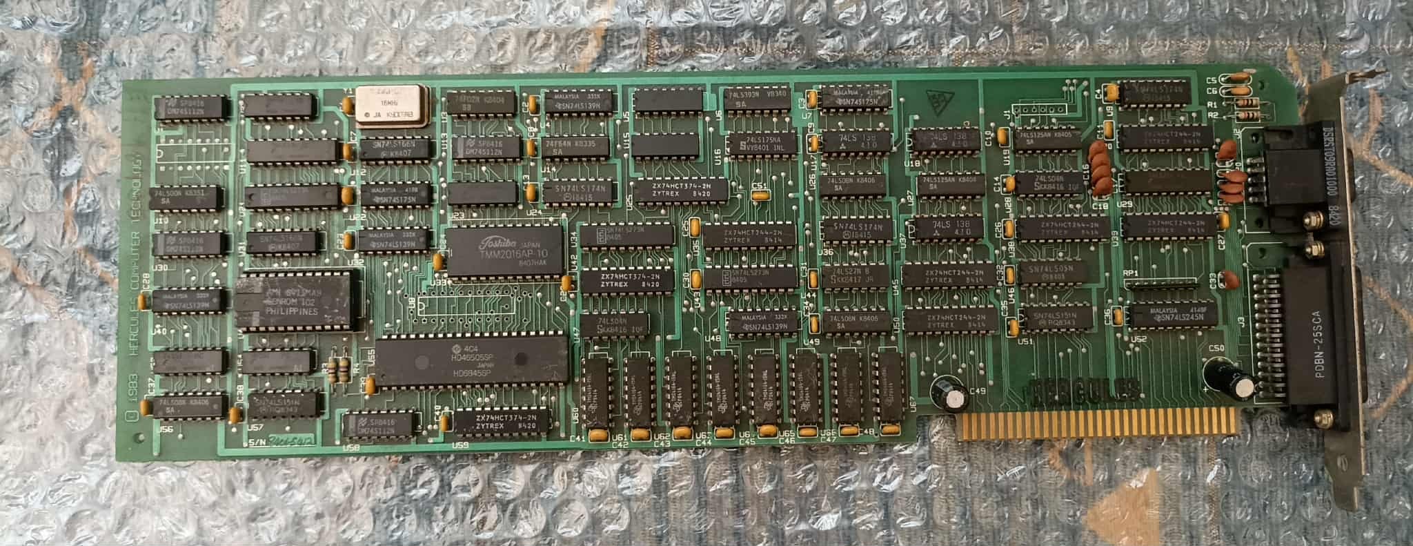 Eladó a képeken lévő, nagyon szép állapotú, tesztelt és működő Hercules videokártya. 1983-ban készült, GB101-es modell (010-0010 REV C). A HERCULES csak egy fekete stencilezett felirat, ilyet más Hercules kártyákon nem láttam.