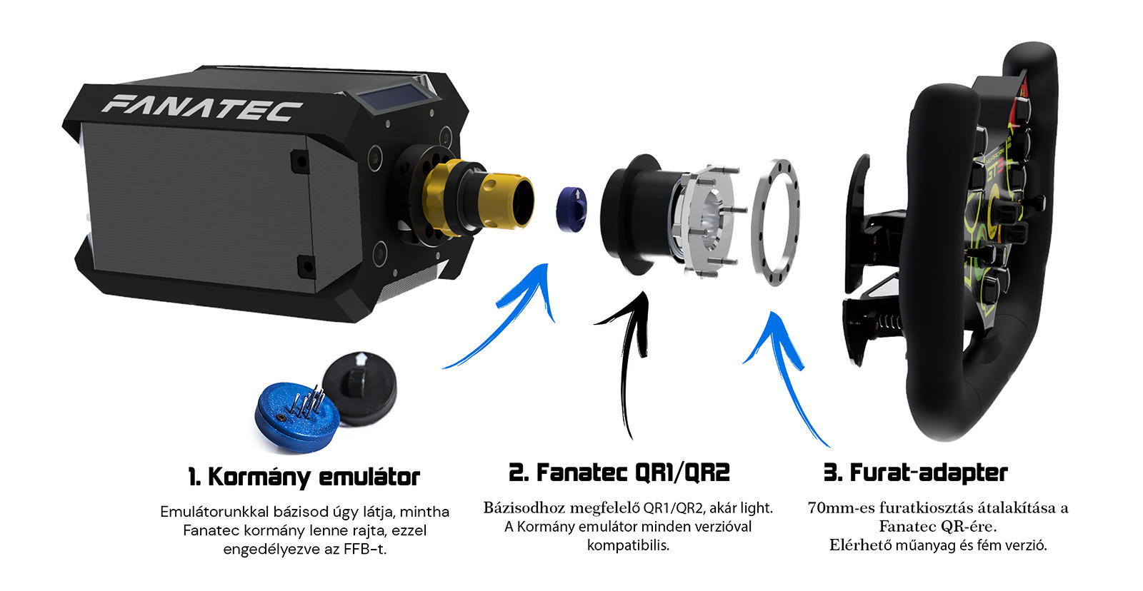 Minden QR1 és QR2-t használó Fanatec bázis, pl. CSL DD, DD Pro, Podium DD1, DD2, CSL Elite, stb.