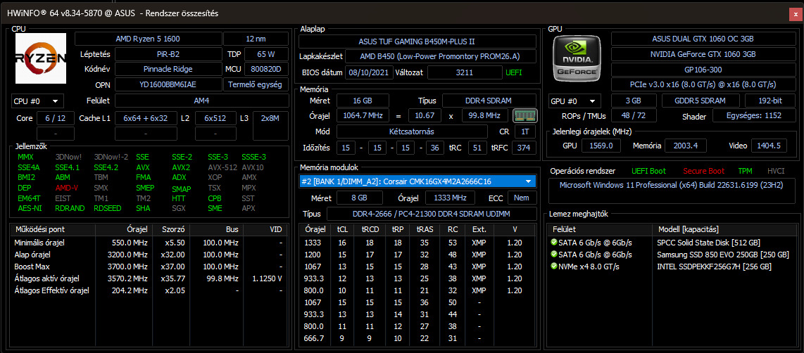 RAM: 2x8GB DDR4 Corsair CMK16GX4M2A2666C16 [2666MHz, CL15 időzítés]