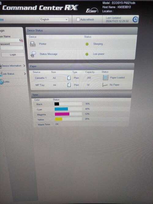 Benne levő tonerek állapota: Cyan 48%, Magenta 53%, Yellow 26%, Black 16% (mind utángyártott).