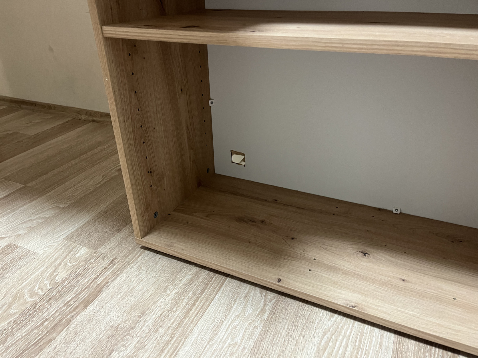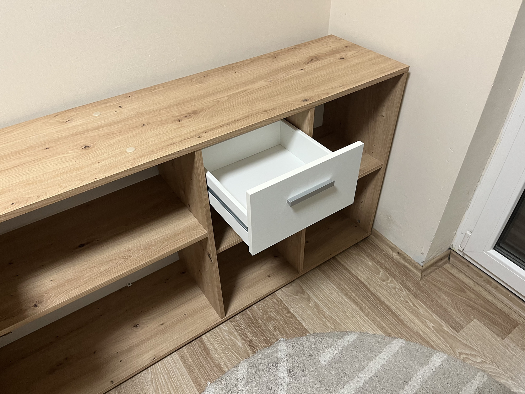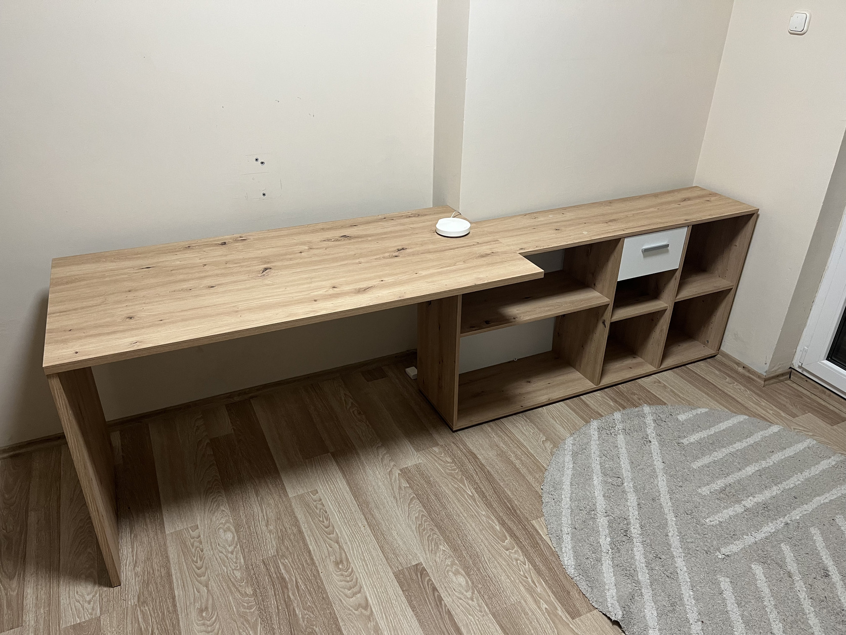 Eladó egy szépállapotú de kisebb hibákkal egy íróasztal. Az alsó polcon kilett vágva egy kis lyuk a kábeleknek és az asztal lap közepén van egy hajszál repedés (így érkezet). Én egymás mellé téve használom azért látszódnak a lyukak de ha L alakba használod akkor nem látszódnak.