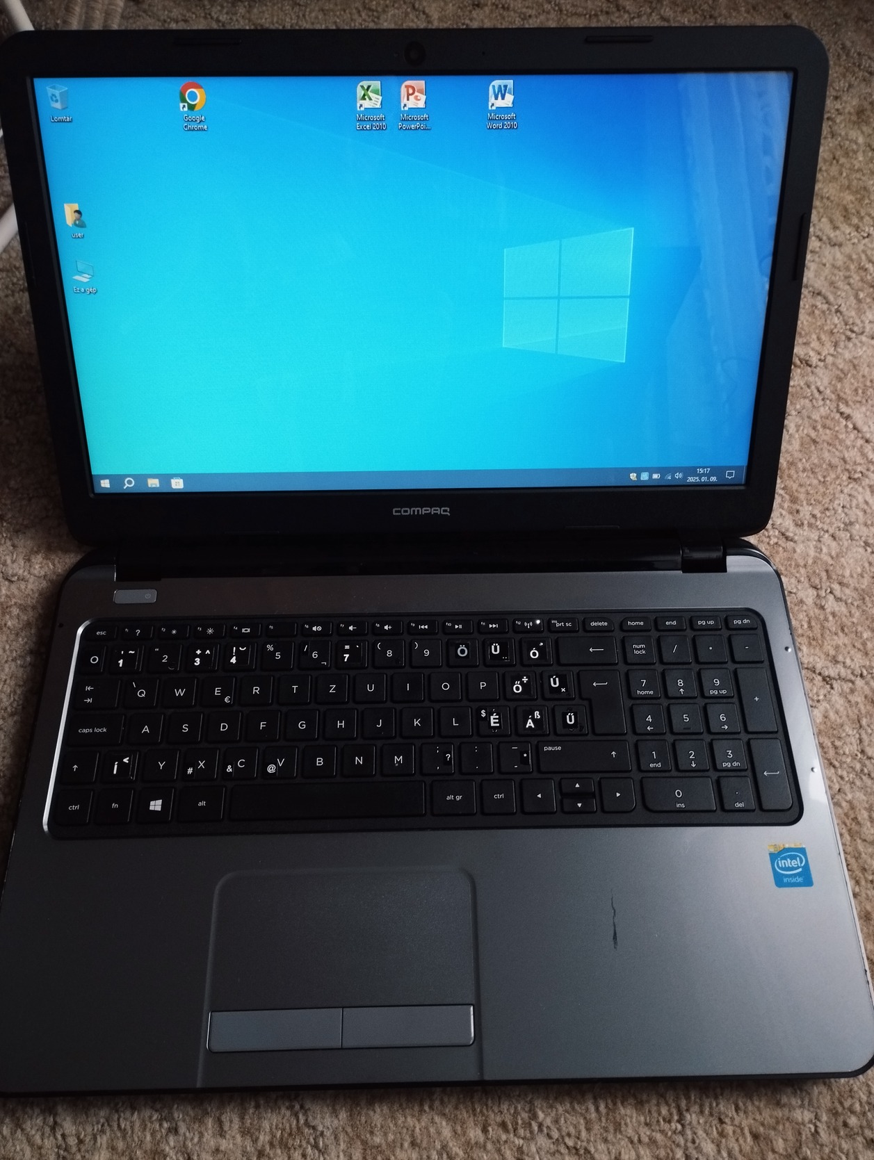 Celeron N2840 2 magos processzor, 4Gb DDR3 memória, 250Gb merevlemez, Intel HD graphics, 15,5 col 16:9 képernyő, wifi,DVD,SD kártyaolvasó,HDMI,webkamera, Magyarított billentyűzet. Windows 10.