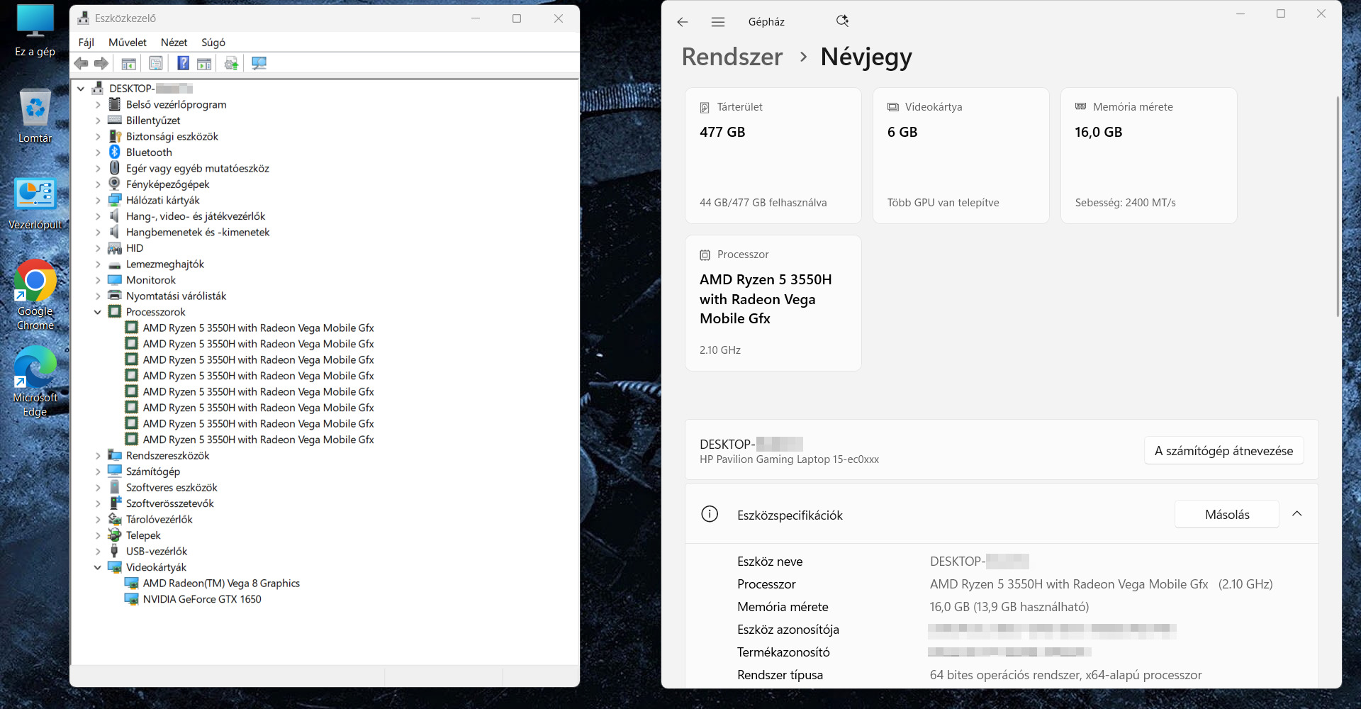 - Videókártya: nVidia GeForce GTX 1650 4 GB + AMD Vega 9