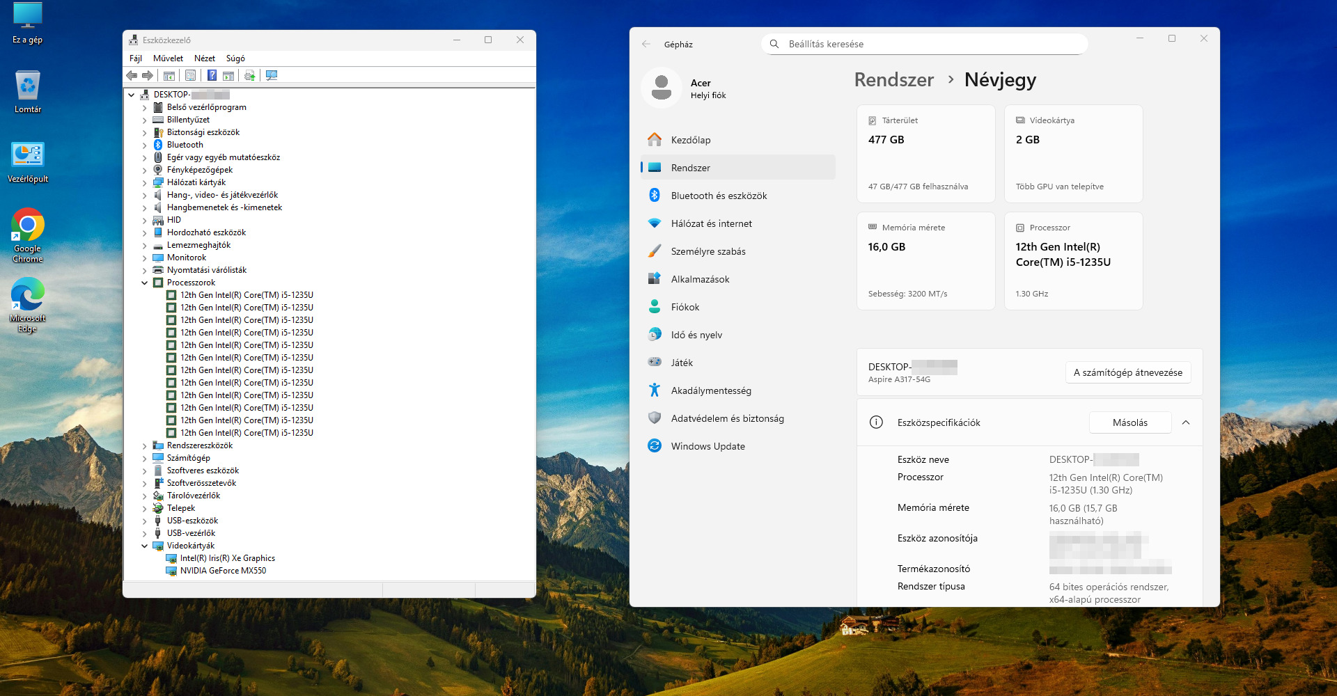 - Videókártya: nVidia GeForce MX550 2 GB GDDR5, Intel Iris Xe