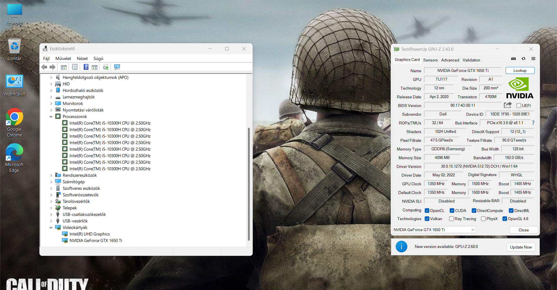 - Videókártya: NVIDIA GeForce GTX 1650 Ti 4 GB GDDR6, Intel UHD Graphics