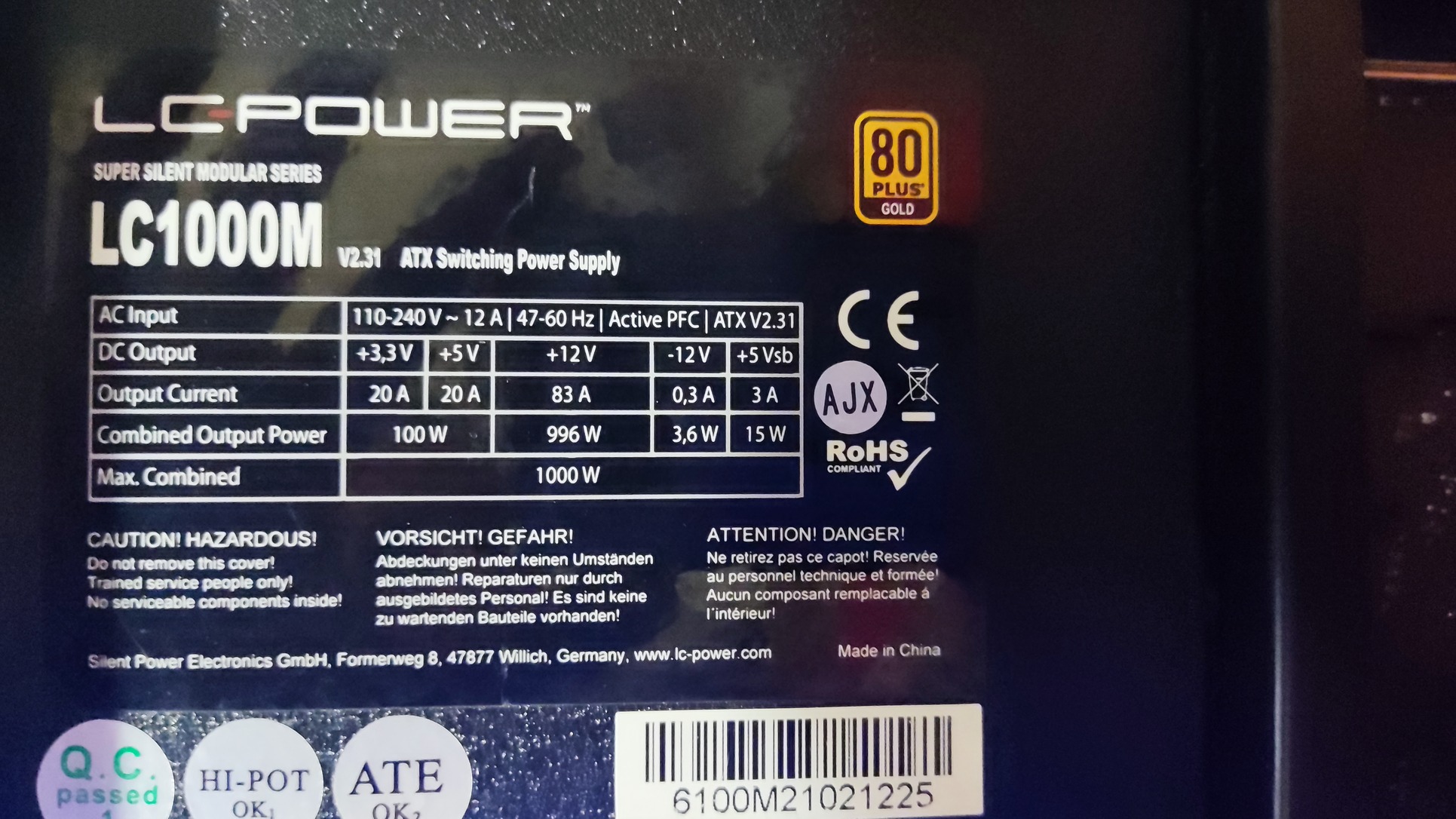 LC-POWER 1000W 80+Gold, +toldókábel.