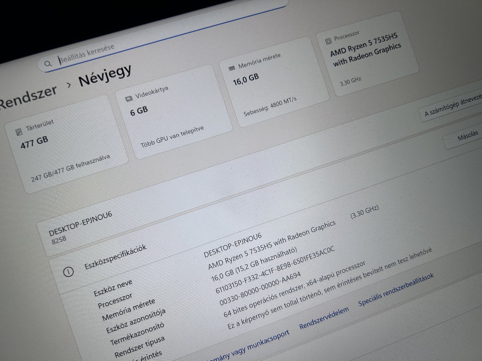 Processzor: AMD Ryzen 5 7535HS (3.30 GHz) Memória: 16 GB DDR5 (4800 MHz) Videokártya:4050 6 GB dedikált GPU (RTX) Tárhely: 477 GB SSD Kijelző: 15,6” (matt) Rendszer: 64 bites Windows
