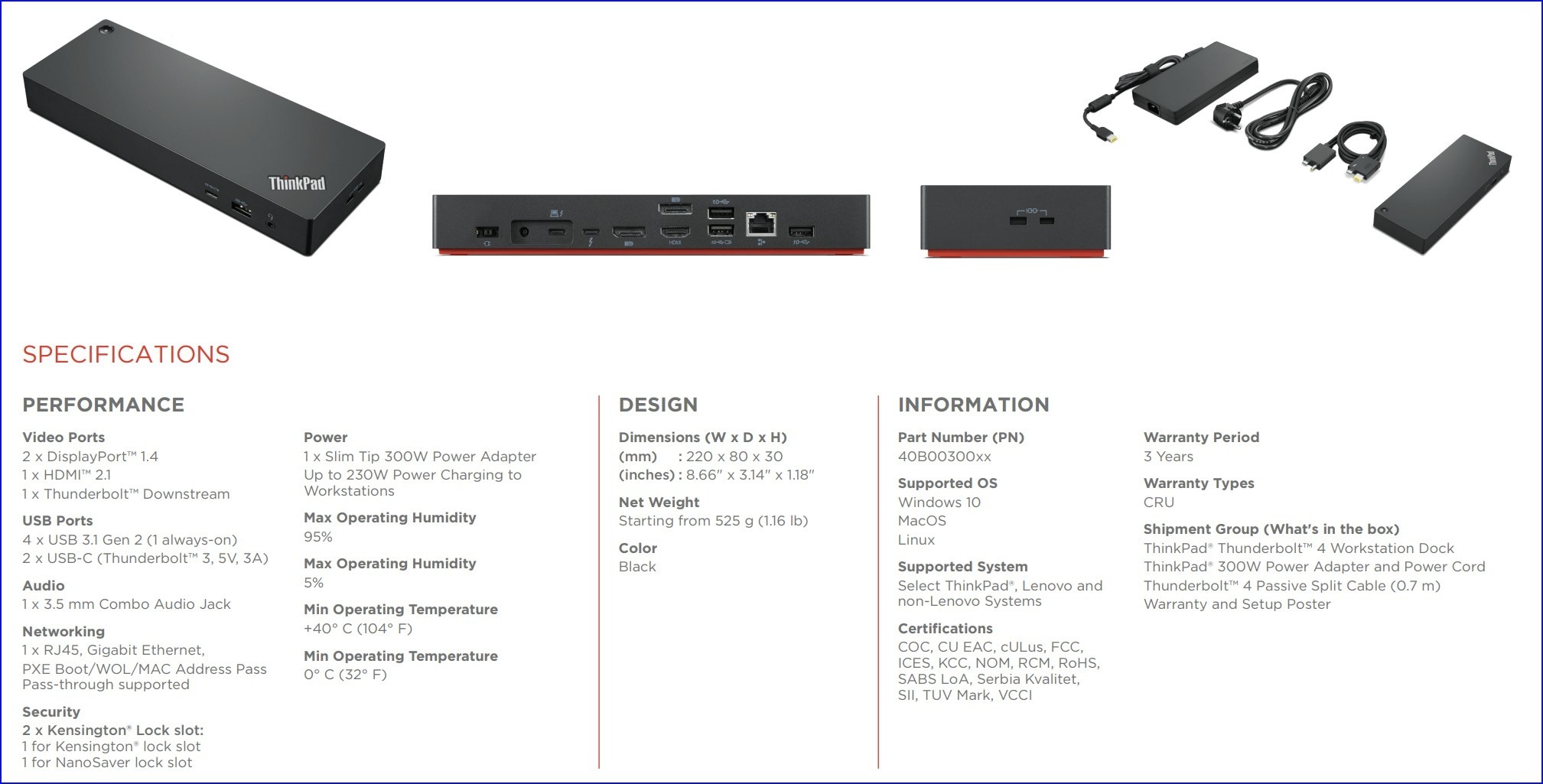 Lenovo 40B0 ThinkPad Thunderbolt 4 Workstation Dock [300W] [40B00300]