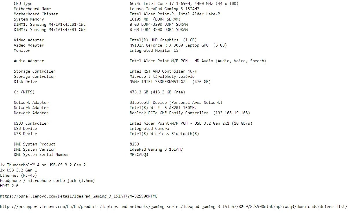 2023 szeptemberében Belgiumban vett Lenovo Gamer laptop eladó. Intel Core i7 (12. gen), 16GB RAM, GeForce RTX3060 videókártya, 500 GB SSD stb. További paraméterei a képek között. Újrahúzott Windows, telepített Office rajta. A képen látható bőrtok is jár hozzá. Budapesten belül szívesen házhoz is viszem.