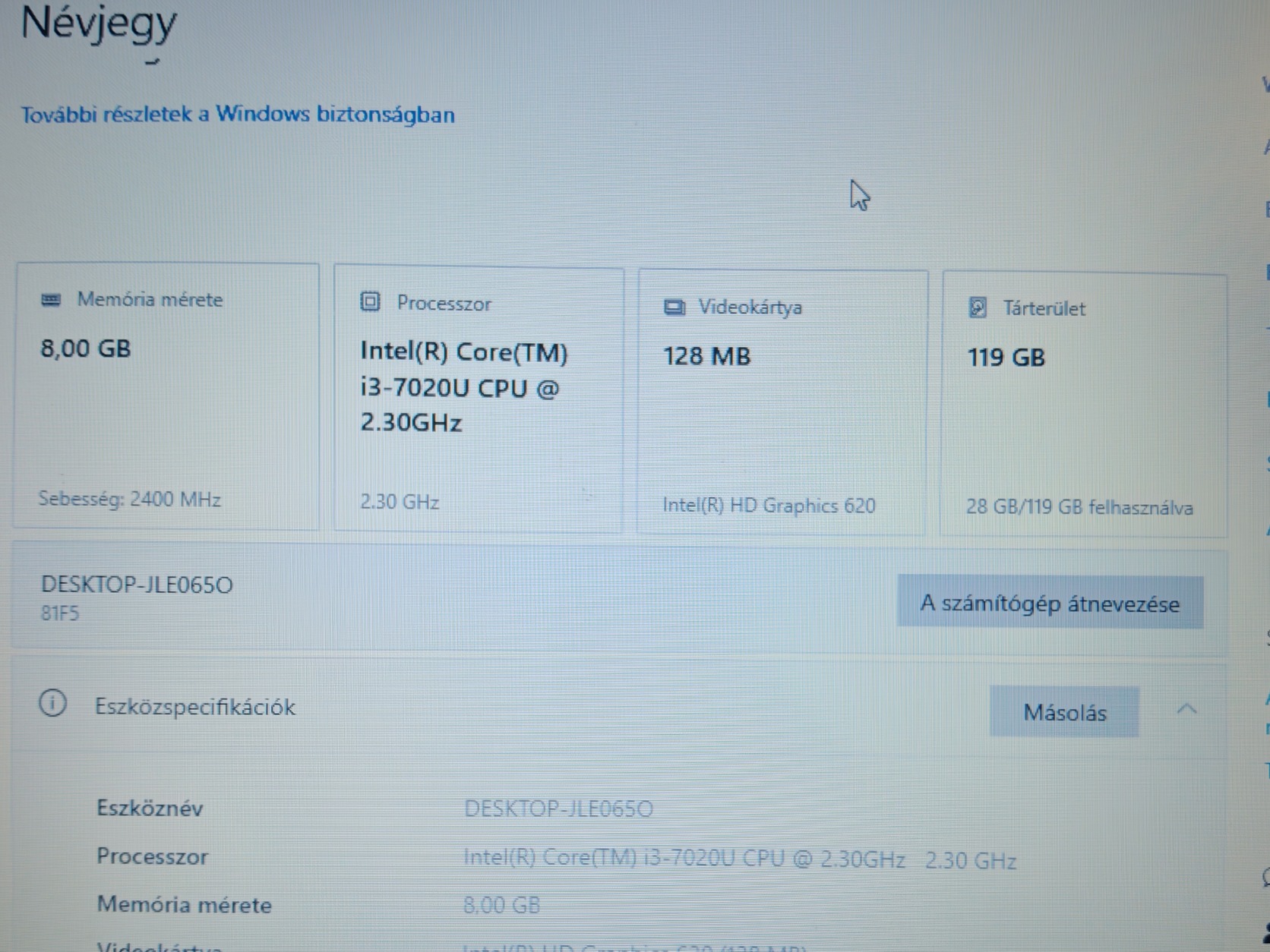 Inetl Core i3 7020U, 8 GB RAM, 128 GB SSD, Windows 10 Pro, gyári adapter.
