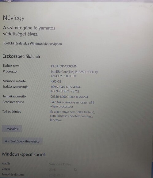 Processzor: Intel Core i5 8250U 1.6 GHz 6 MB