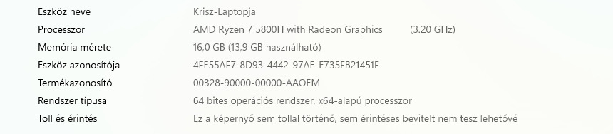 Processzor: AMD Ryzen 7 5800H (3.20 GHz) Radeon Graphics