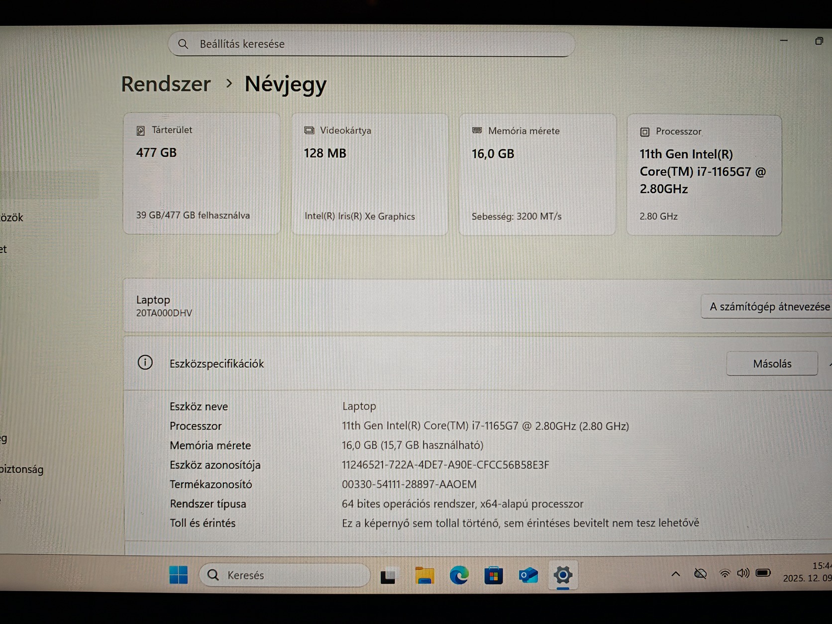 Alap adatok: 11th gen i7, 16GB DDR4, 512SSD. Win11