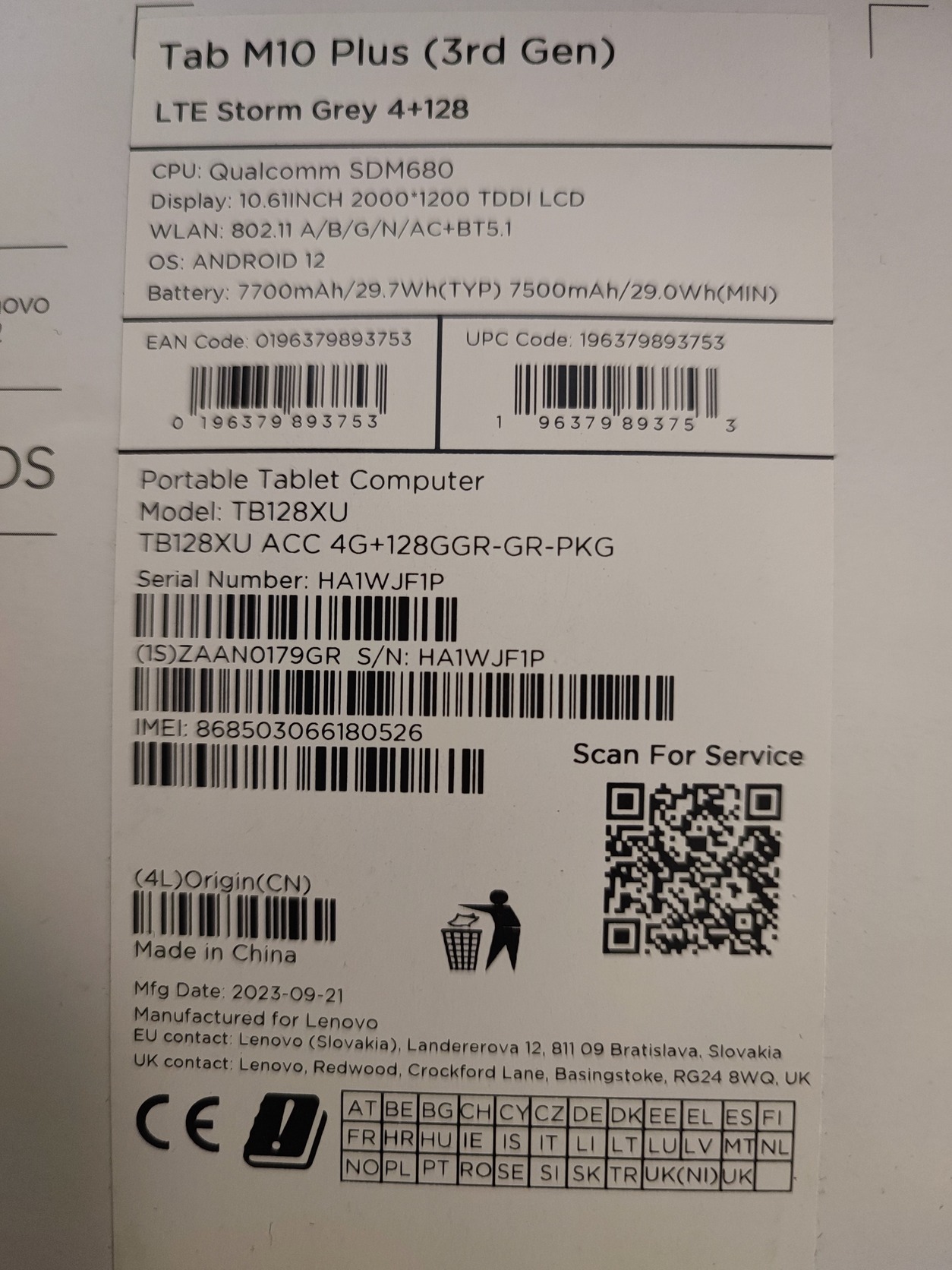 Lenovo M10 Plus 3rd Gen 128+4GB