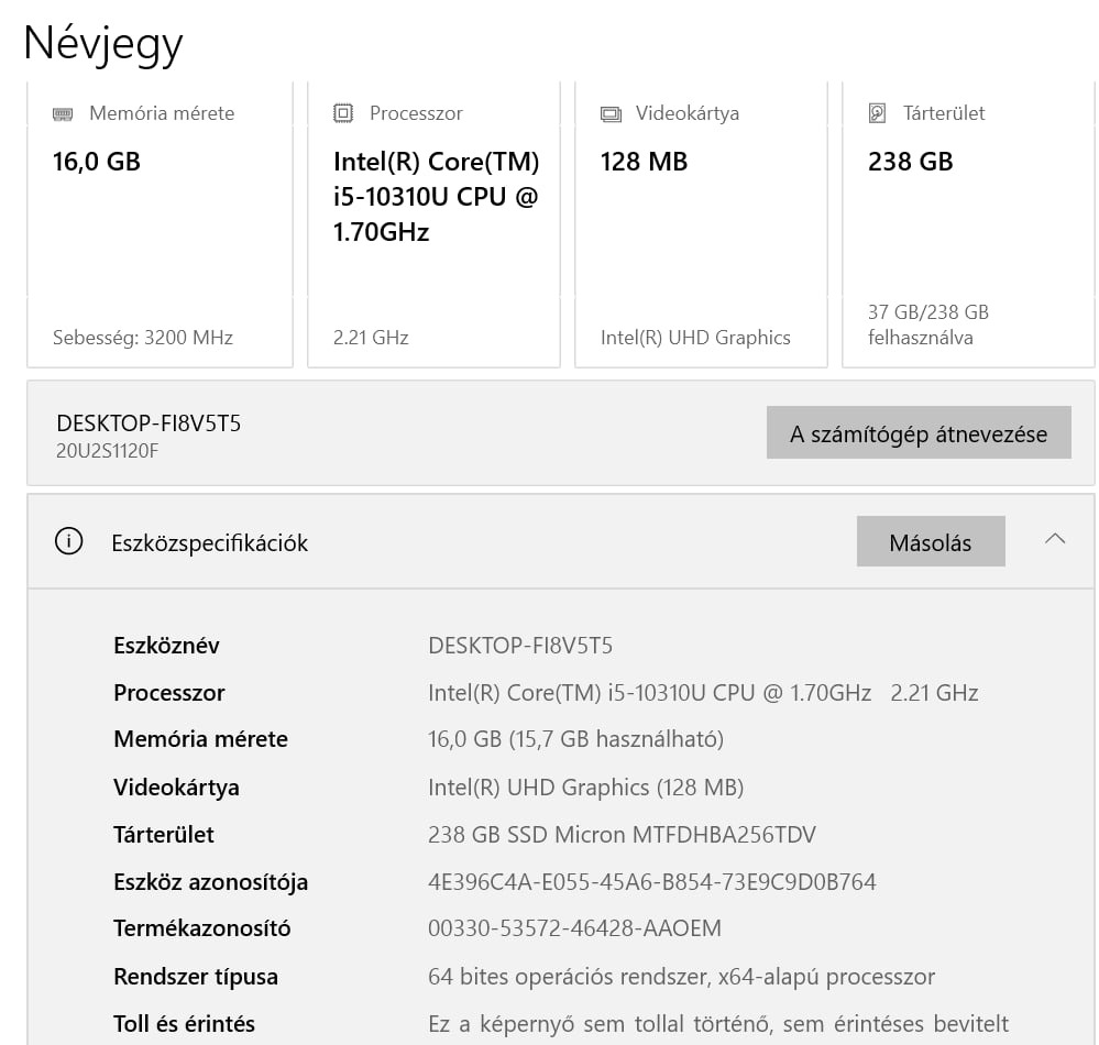Processzor: Intel(R) Core(TM) i5-10310U CPU @ 1.70GHz 2.21 GHz