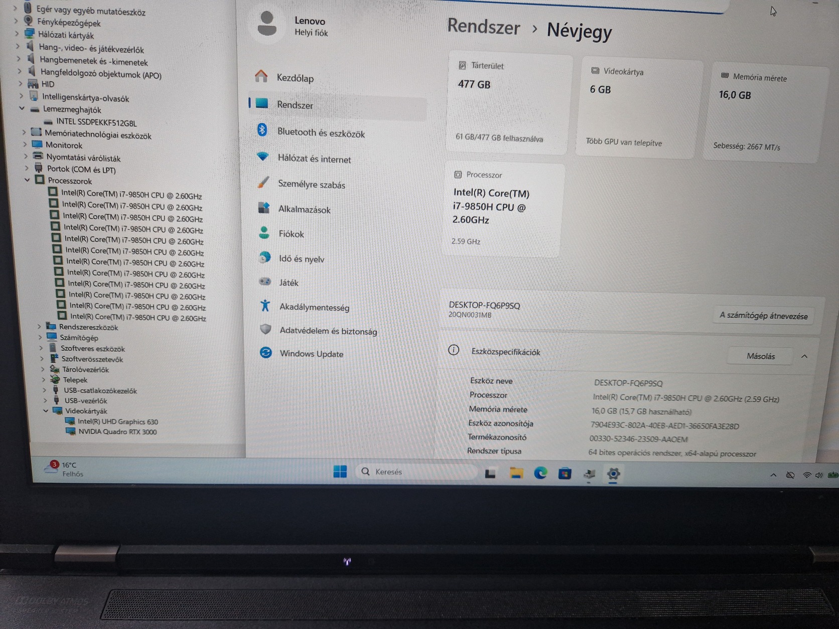 512 GB NVMe SSD (bővíthető, több hely van még benne tárhelynek)