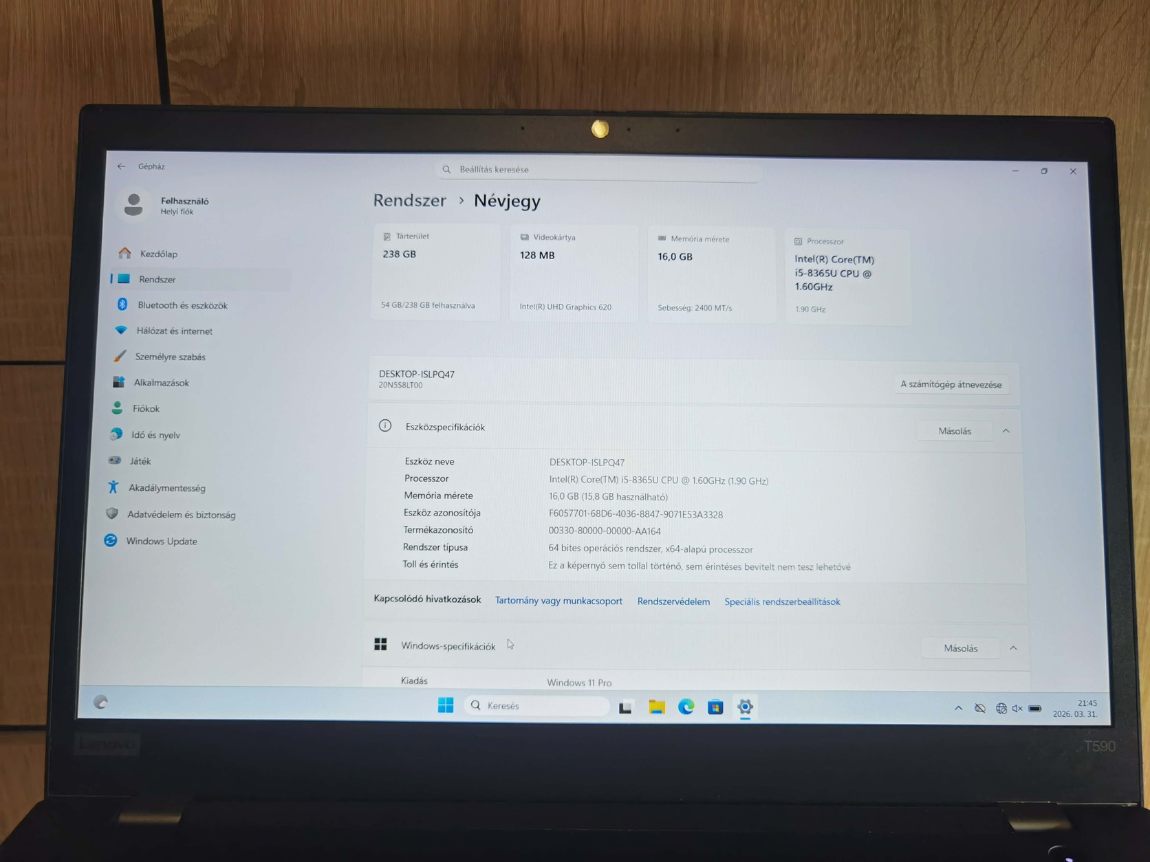 Eladó Lenovo Thinkpad T590 jó akksival amellyel 4-5 órat bír (felhasználástól függően)