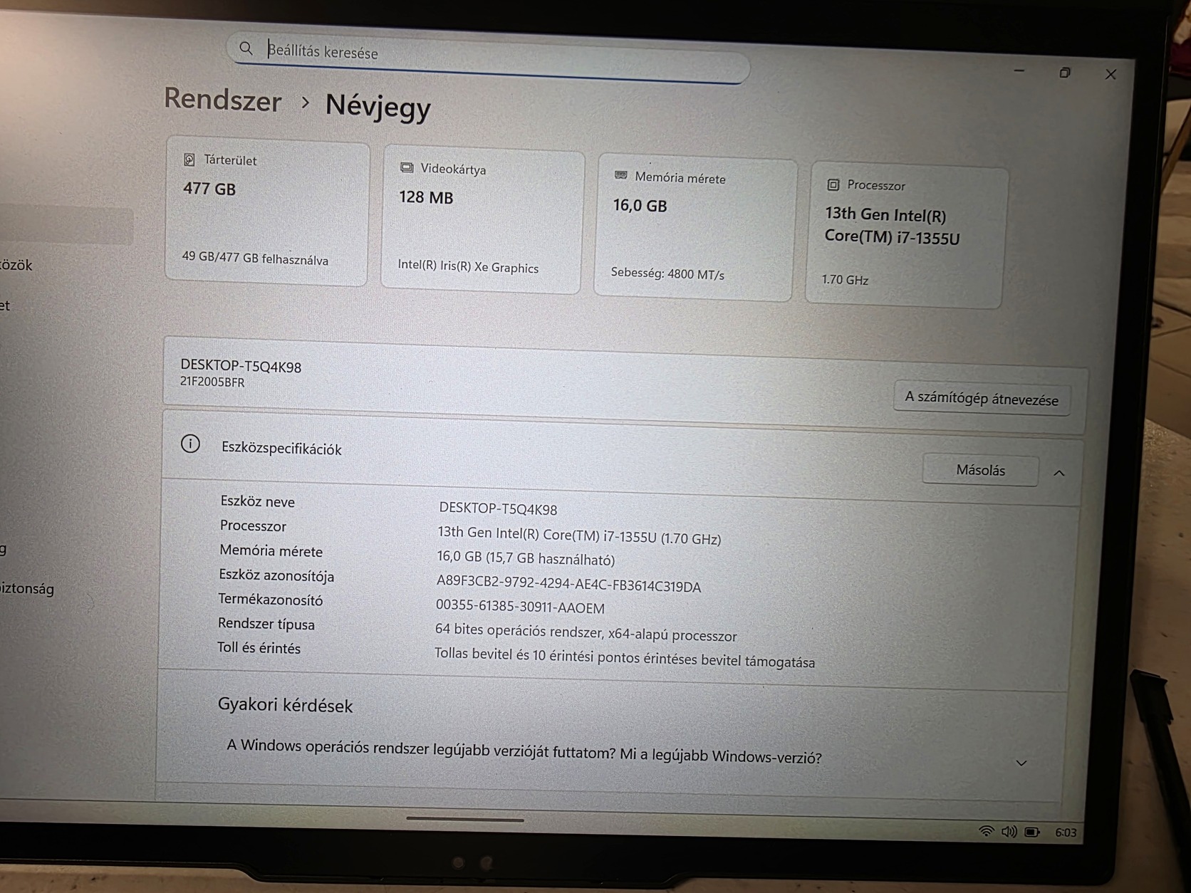 Memória: 16 GB LPDDR5 RAM (nagy sebességű, alacsony fogyasztás)