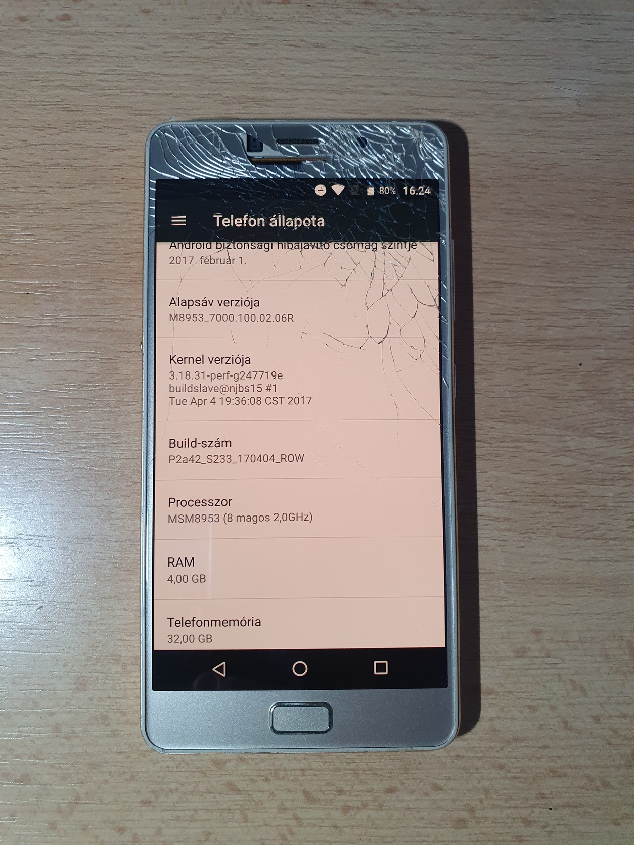 P2a42 típus, dual sim, független. 4 GB RAM, 32 GB tárhely, Snapdragon 625 processzorral (8x2.0GHz), Android 6.0.1 rendszerrel (képen nem az szerepel, és sok alkalmazás már nem elérhető rá, pl. Youtube). Típushiba "javítva" (kikapcsolás után nem töltött be többé a rendszer, bootloopban ragadt még android 7-el), ezzel a rendszer verzióval most épp működik.