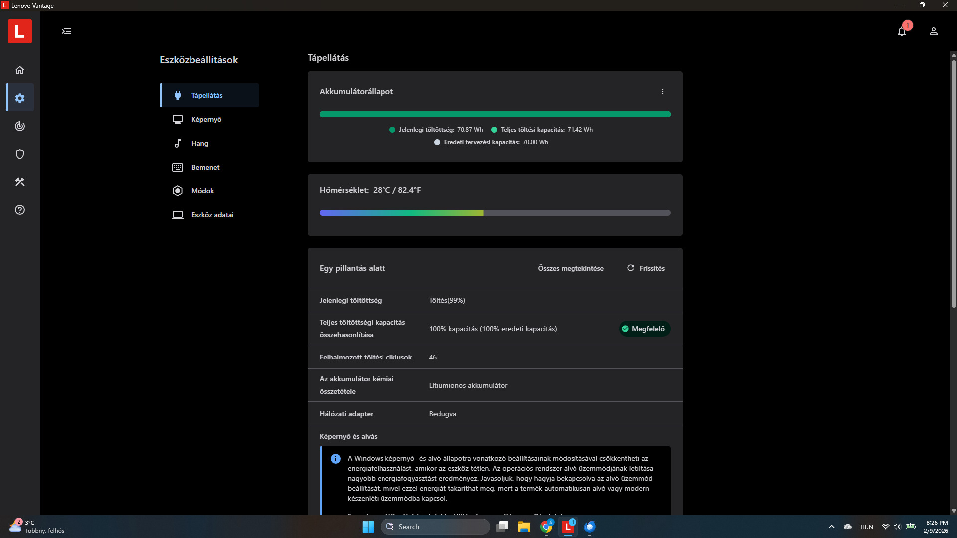 Az akksiban 46 ciklus van, 100%-os kapacitás az eredetihez képest.