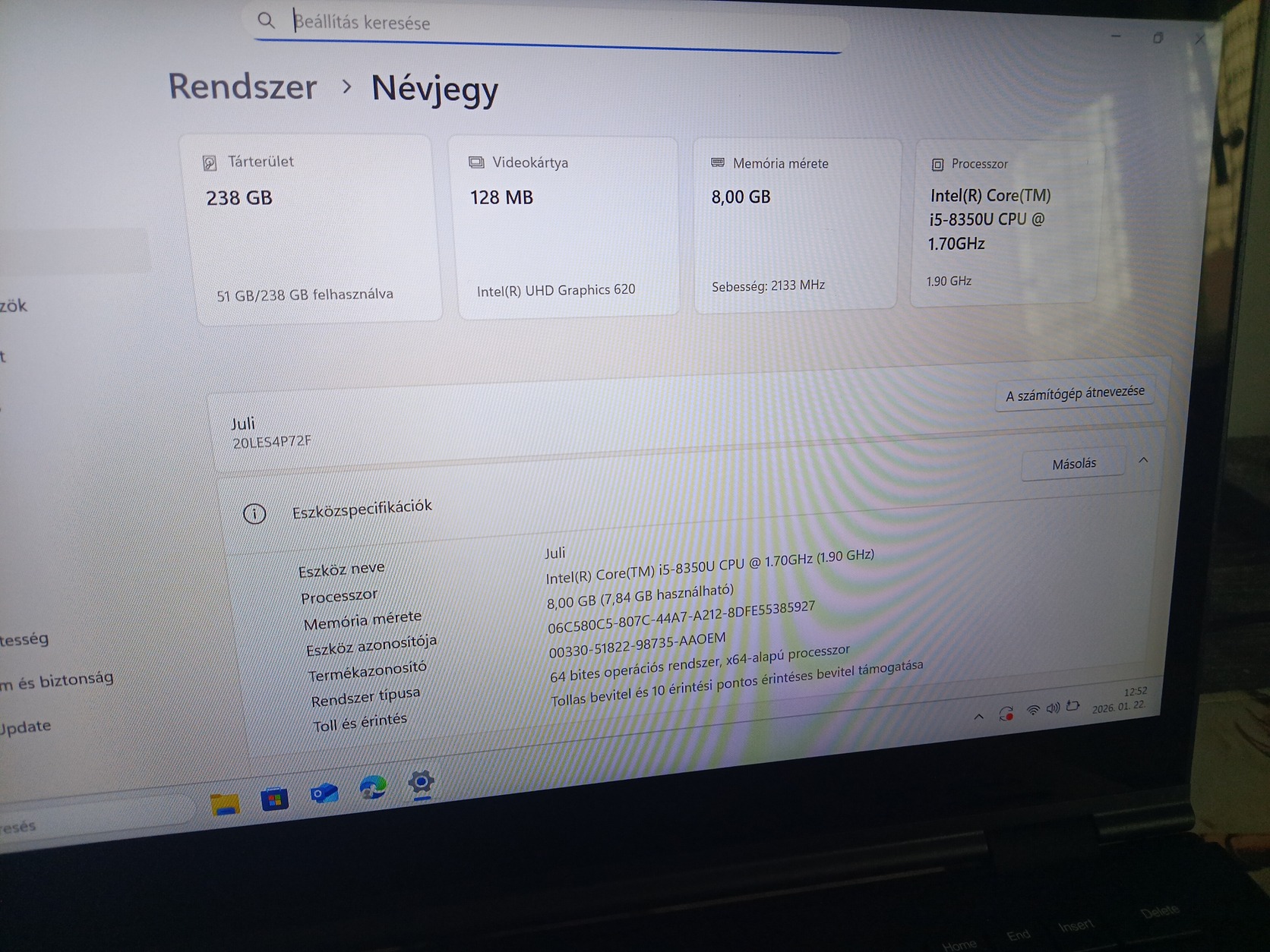 Fullhd Felbontás, i5 8gen, 8gb ram, 256ssd.