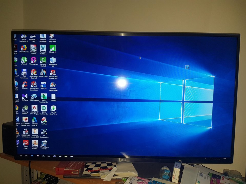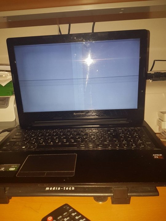 Annyi a hibája, hogy a beépített kijelző bekapcsolás után fehér marad és csíkok jelennek meg rajta (a képen látható). HDMI kábellel külső monitoron vagy tv-n viszont ad képet. (képen ez is látható).